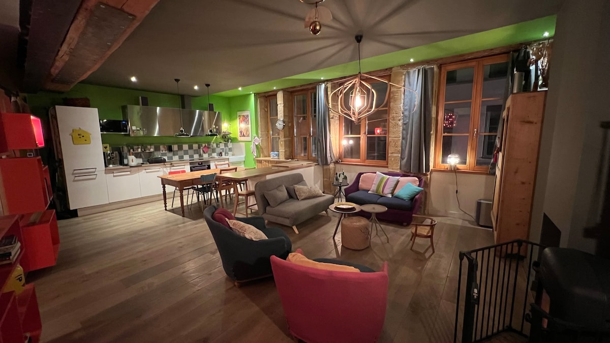 Spacious and bright loft canut (which in the 19th century housed silk weavers and their imposing looms, which are now part of Lyon's heritage with its 4-meter ceiling height.) With a surface area of 70m² plus a 20m² mezzanine in the heart of the village district of Lyon Croix Rousse, with exposed beams and stones, without vis-à-vis, in absolute calm with a breathtaking view of Lyon. 15 mins walk from the parc de la tête d'or and its lake.