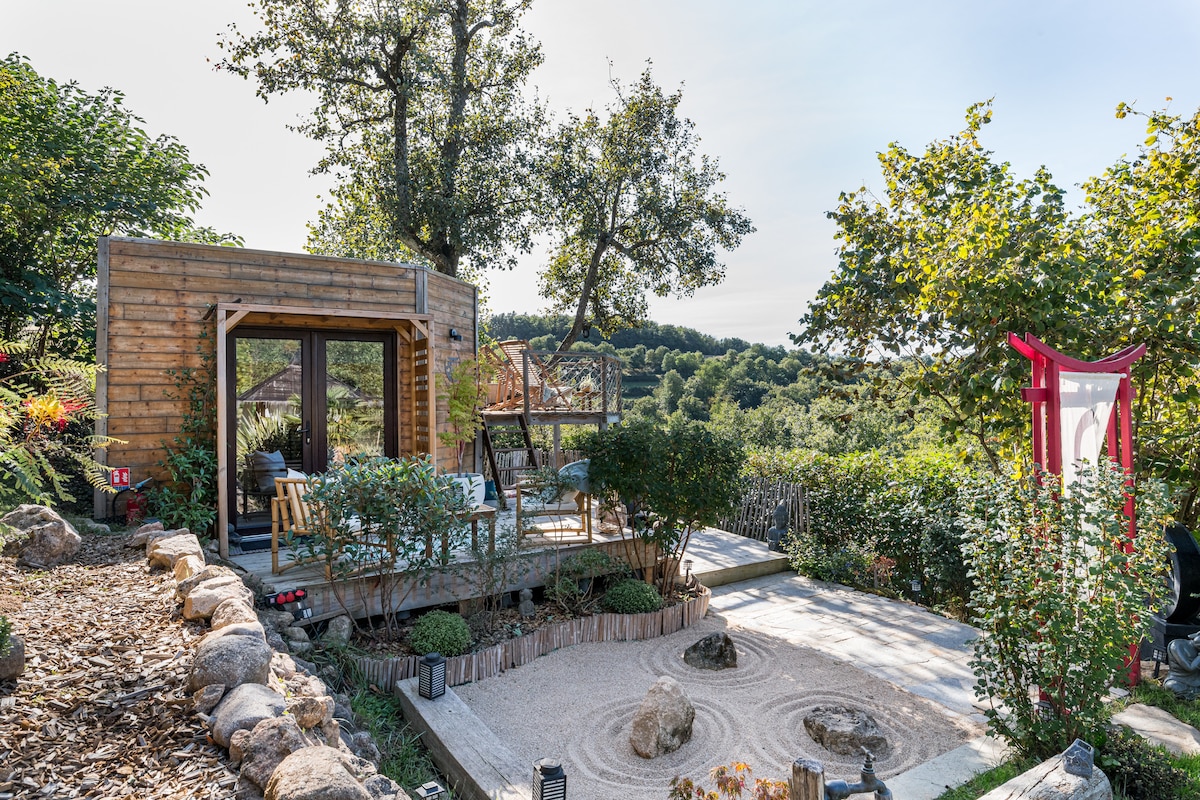 Bienvenue au ryokan japonais 旅館, un lieu unique où l'âme du Japon rencontre la nature de l'Ardèche. Vivez l'expérience des auberges traditionnelles japonaises, en bois naturel et design minimaliste. Sur les hauteurs du village, le ryokan vous invite à un séjour hors du temps, pensée pour le calme, la simplicité et la déconnexion. A l'extérieur, ses terrasses donnent sur le bassin à poissons et le jardin de méditation. Et pour compléter l'immersion, réserver le bain Onsen (温泉) ( jacuzzi)