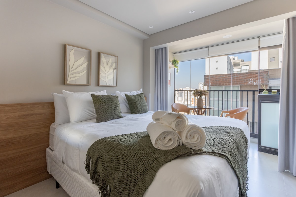 Estúdio espaçoso com muito design, arquitetura e a melhor vista de São Paulo. Loft completo! Com cama queen, closet, ar condicionado silencioso, cozinha completa, home office, WI-FI, TV 55” e uma belíssima banheira de imersão, de onde pode apreciar o seu drink preferido e curtir uma vista apaixonante. São Paulo toda estará há poucos minutos de você. Acesse o metrô andando apenas 200m. Reserve com tranquilidade! Proporcionaremos uma excelente hospedagem e uma ótima experiência!