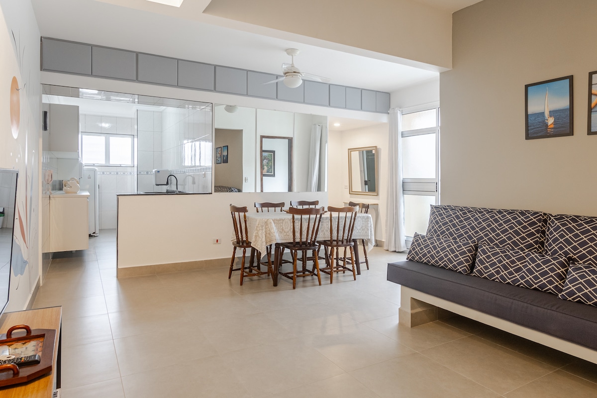 • Frente para o mar, arejado e muito aconchegante; • Localização excelente no Itararé - tudo o que precisa ao redor (restaurantes, mercados, padarias, farmácias), podendo fazer tudo a pé; • 1 vaga disponível - garagem rotativa, com manobristas 24h (chave fica na portaria). Caminhonetes não são aceitas. • 2 quartos --> acomoda preferencialmente 4 pessoas, podendo ser estendido até 6, com adição de R$ 75/diária para 5ª e 6ª pessoa extra; • Pet friendly --> taxa única de R$ 30,00/pet