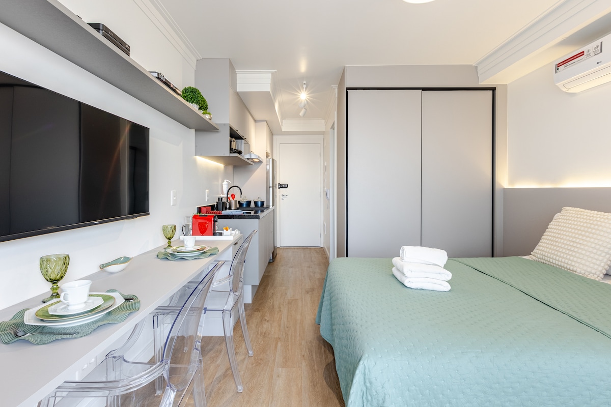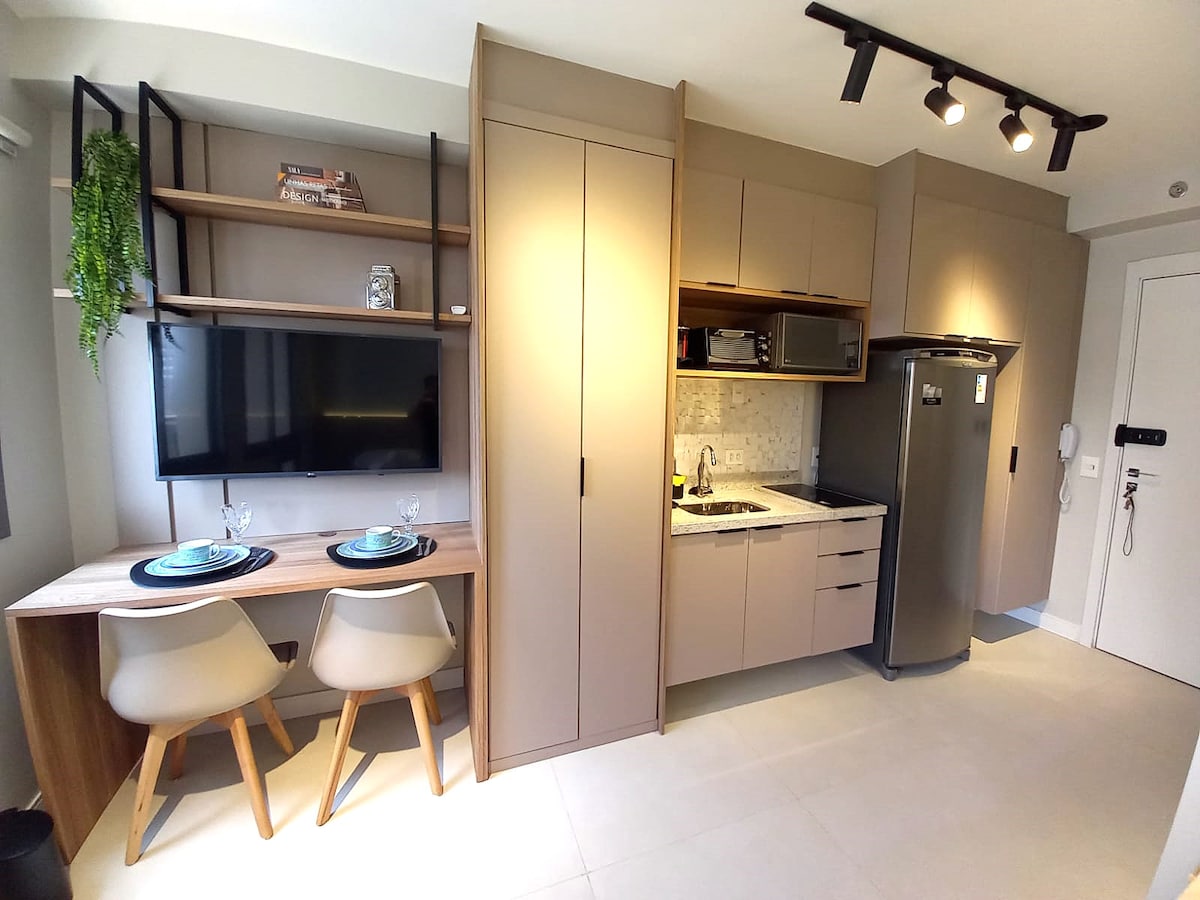 New studio, very well decorated and equipped, with all the necessary amenities for your stay. Fully automated, comfortable, cozy. The building is modern with an excellent leisure infrastructure: swimming pool, gym, ballroom with bar, coworking, laundry and bike rack. It has a green view of the square, the street is quiet and easily accessible. It is located between the neighborhoods of Moema, Brooklin and Vila Olimpia, 5 minutes from Shopping Ibirapuera and 15 from Congonhas Airport.