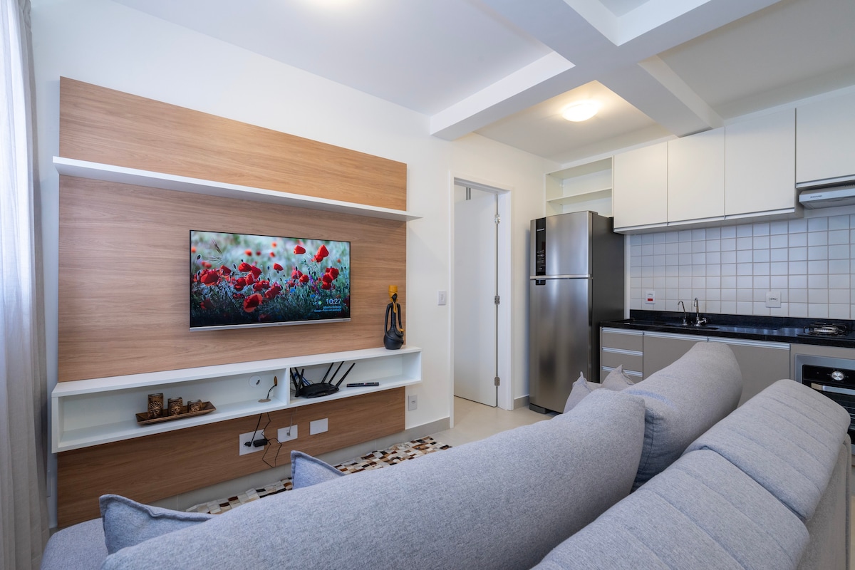 New studio, very well decorated and equipped, with all the necessary amenities for your stay. Fully automated, comfortable, cozy. The building is modern with an excellent leisure infrastructure: swimming pool, gym, ballroom with bar, coworking, laundry and bike rack. It has a green view of the square, the street is quiet and easily accessible. It is located between the neighborhoods of Moema, Brooklin and Vila Olimpia, 5 minutes from Shopping Ibirapuera and 15 from Congonhas Airport.