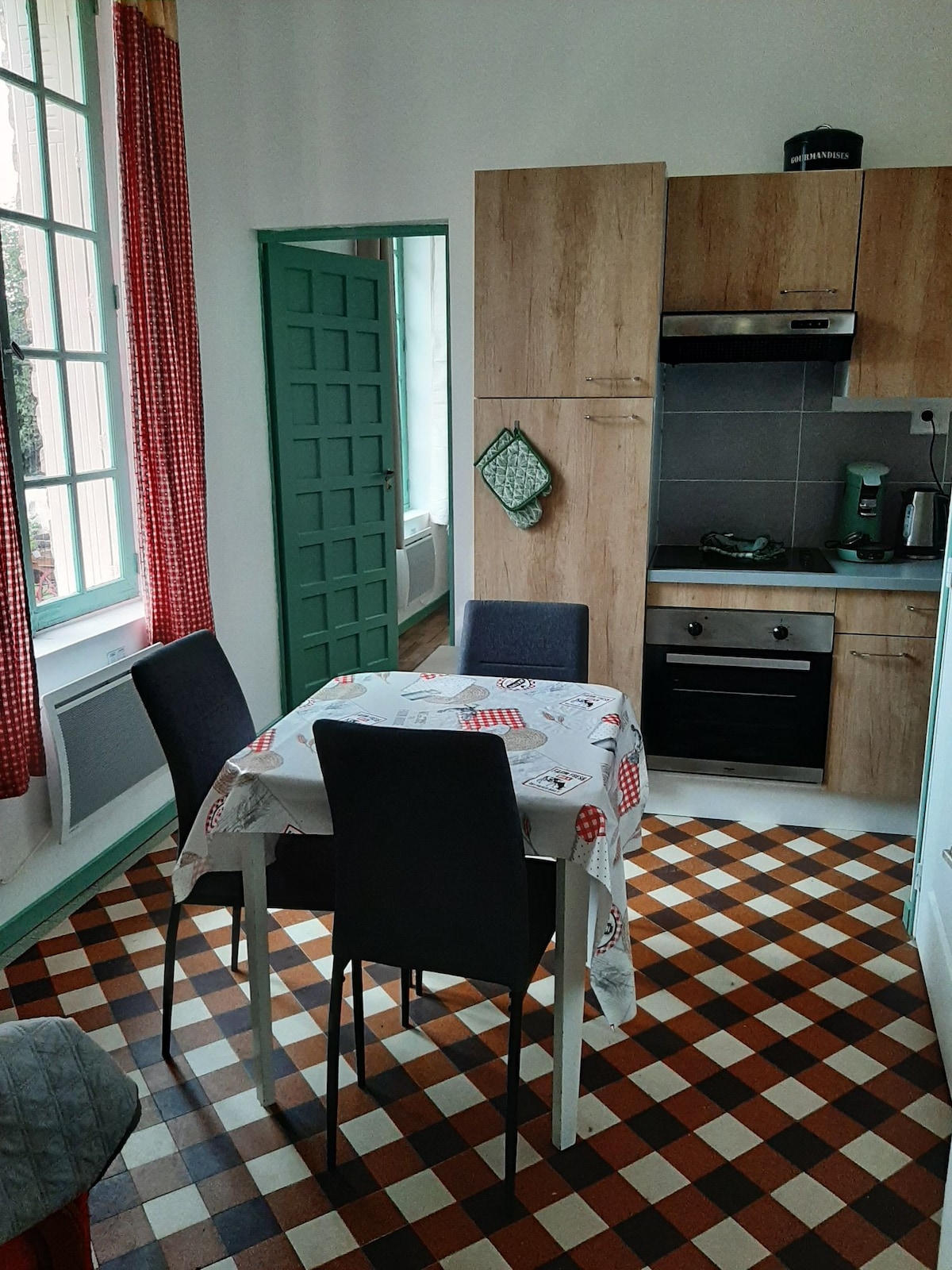 Appartement de 35m2 à dans un joli bâtiment avec petit café /bar (vendredi au dimanche) et chineterie. (ouvert le vendredi) libre entre, nous ne sommes pas sur place. à 3km du circuit du vigeant Salle de bain avec douche italienne, toilette et lavabo. Cuisine équipé, chambre à couché avec lit double. Possible de mettre en 2 lit simple sur demande. Dans le bourg du village, parking dans le rue. Animaux accepte. proche des chemins, étang de pêche. Pas de wifi dans l'appartement