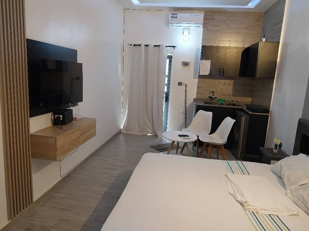 Nous vous proposons ce bel appartement dans la ville d’Abomey-Calavi, non loin de la capitale économique Cotonou. Il est proche du plus grand centre commercial Super U. et à quelques minutes de la Venise d’Afrique (Ganvié). C’est un appartement moderne climatisé (Salon spacieux et 2 chambres indépendantes) fonctionnel avec une cuisine entièrement équipée (cuisinière – four à gaz, etc.). La piscine complètement privée au Rooftop est parfaite pour votre détente et vous sera exclusive.