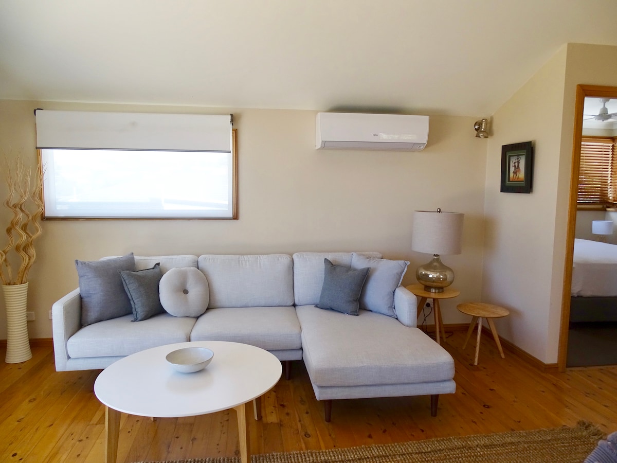 Floor to ceiling views just 10 minutes walk to the beach. This space has the feel of a luxurious cabin with all the amenities of a high-end apartment. Take in the leafy, ocean views in our secluded, self-contained apartment. The sunlit rooms have an easy coastal elegance for relaxing or working while taking in the view.