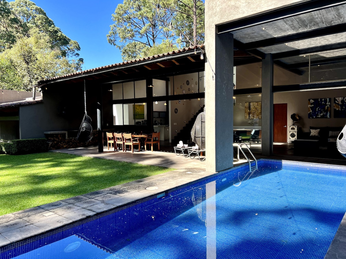 Casa con vista al lago y a las montañas, en medio del bosque, con un jardín propio de 5,000 m2, alberca privada con calefacción y gimnasio privado; ubicada en un fraccionamiento con seguridad las 24 hrs. Diseño arquitectónico en desniveles con techos altos a dos aguas, vigas y columnas de madera, teja roja, barro y madera. Decoración con elementos tradicionales de una casa mexicana contemporánea. Excepcionalmente iluminada con vistas al bosque y jardines desde cualquier ventana.