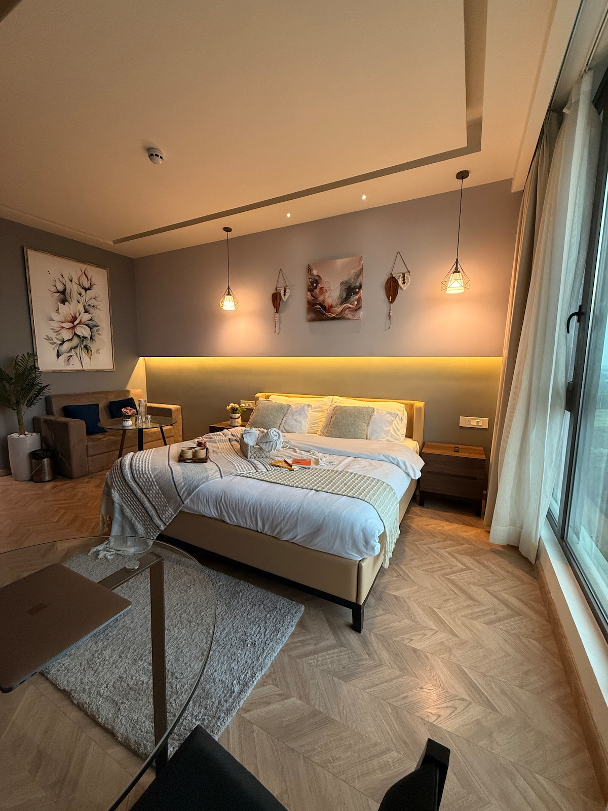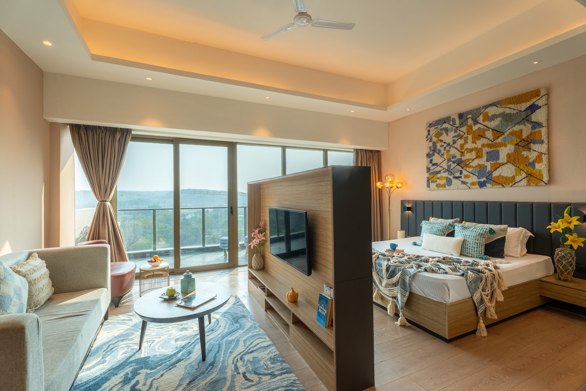 Take it easy at this unique and tranquil getaway.Wake up to refreshing Aravali views at Penthaus Studio 17, a bright and stylish space designed for peaceful mornings. Soft tones, clean décor, and warm sunlight create a calm, uplifting vibe. The studio features a cozy lounge, comfortable sleeping area, and a fully equipped kitchen. Large windows bring in natural light, while full-length curtains offer privacy whenever needed. Current Location : Citadines Paras Square, Sector 59, Gurugram