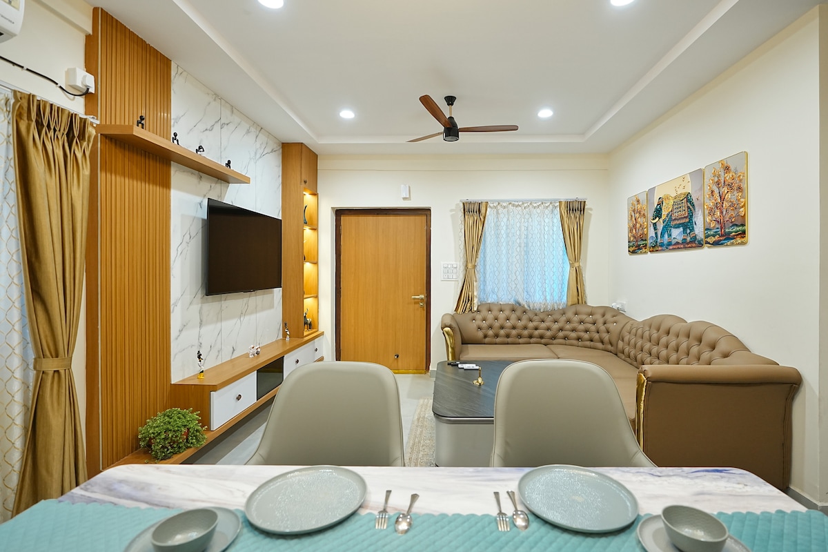 Welcome to our stylish 3 BHK apartment, ideal for short or long stays. Enjoy 3 AC bedrooms with attached baths, a cozy living room with a 43" Smart TV, high-speed Wi-Fi, and an indoor swing. The fully equipped kitchen includes a gas stove, microwave, RO purifier, fridge, and utensils. Conveniently located near Hitech City Metro, Usha Malpuri's Kitchen (100 m), US Visa Center (1 km), Cable Bridge, and major IT hubs..