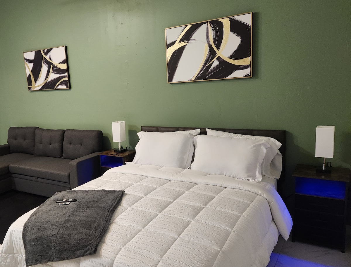 Your private modern studio oasis awaits! Separate entrance, designated parking, queen bed, and loveseat pull-out make it ideal for couples, solo travelers, or small families. Relax on the patio or cook light meals in the kitchenette with induction cooktop, air fryer, fridge, and coffee bar. Minutes from Ave Maria, Naples beaches, trails, dining, Great Wolf Lodge, and local shops—comfort and convenience in Golden Gate Estates!