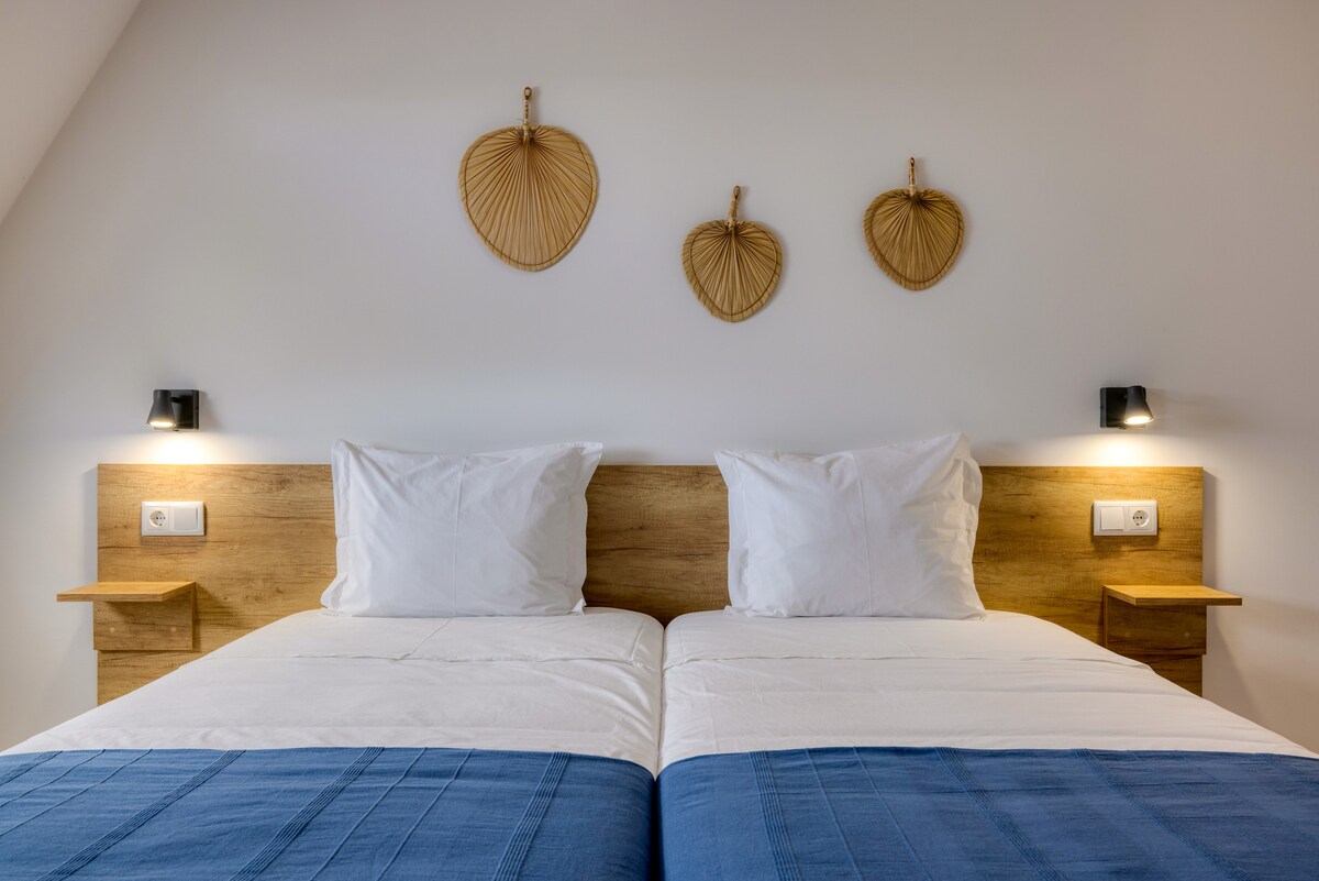 O quarto Twin Deluxe é um quarto amplo cheio de luz natural composto por duas camas individuais, casa de banho privativa e minibar. O quarto insere-se no empreendimento de turismo rural "Forja" na Lagoa de Mira. Desfrute de uma experiência luxuosa quando ficar neste lugar especial.