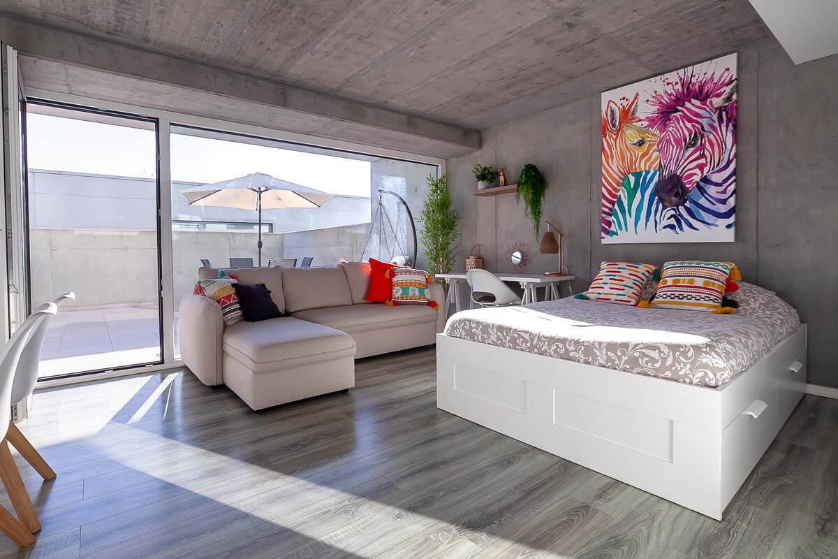 Modern studio located in the Centre of Aveiro. 1min from the train station and 10 min walk from the canals and moliceiros. Flat with all amenities, including private garage and balcony with dining and living space. Possibility of placing baby cot or mattress for children up to 10 years without extra charge.