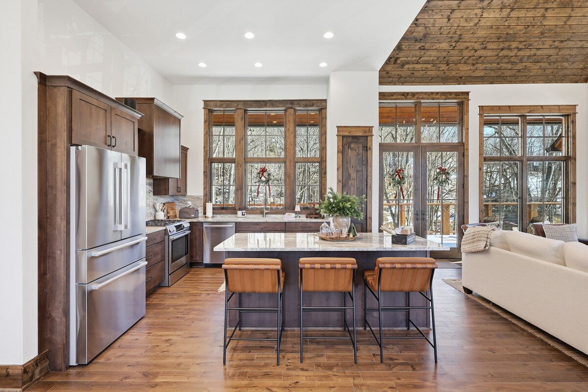 The A-Frame on Blueberry Hill can comfortably sleep 8 guests. You will love the huge deck & the large hot tub. The property sits on 5 acres made up of rolling hills & 2 small ponds. In addition to the king & queen bedrooms, there is an upstairs loft area with a queen bed adjacent to the bathroom, as well as a recently renovated full basement with a set of bunk beds, a queen bed, and a large sectional sofa and TV. This is a perfect spot for kids or teens!