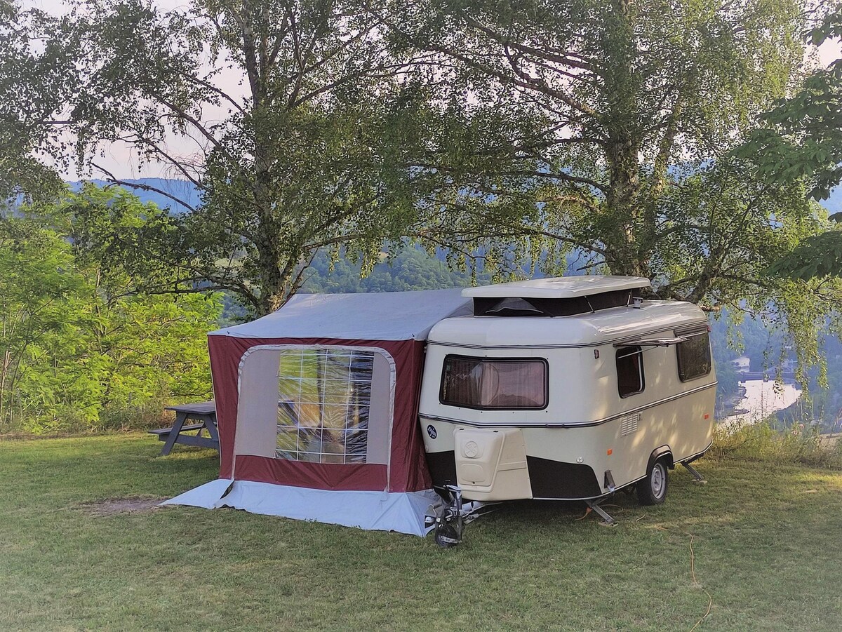Vue imprenable sur le village d'ENTRAYGUES/TRUYERE dans une caravane et son auvent vintage (année 80). Tout y est d'époque, vaisselle/déco pour les nostalgiques de ces années-là. A l'intérieur de la caravane : petit lit (137/183), réfrigérateur, gazinière, évier, placard, coin repas. Sous le auvent : coin repas Table de pique-nique extérieure Vous avez, non loin de la caravane, une douche chaude, des toilettes sèches, un coin cuisine/repas sous barnum à partager avec d'autres campeurs