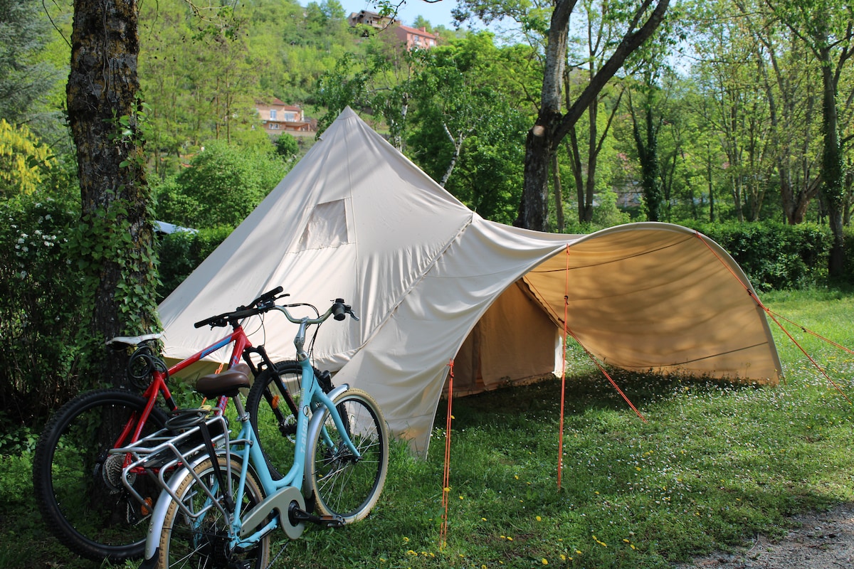 De luxe safaritent ligt in de bergen van het natuurpark 'Les Grands Causses' en is ideaal om te onthaasten en te genieten van de rust, ruimte, flora en fauna van de stree, een mooi wandelgebied en een uitdaging voor de fanatieke fietser! De tent heeft twee slaapkamers, een keuken, eettafel en zithoek en een terras. Naast de tent staat het badgebouw. Eén huisdier is welkom ( €10 per week/verblijf). WiFi is aanwezig! Er is bereik van Orange.