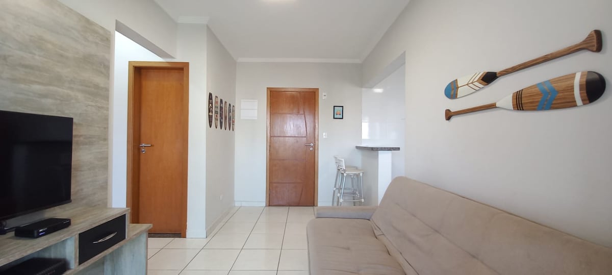 Apto 3 minutos a pé da praia, da calçada vc vê a orla da praia. 1 vaga de garagem no prédio, elevador, portaria 24h, fechadura eletrônica, varanda, 1 dorm com tv smart, cama king, ar condicionado, ventilador, 1 wc amplo. Sala espaçosa com sofá retrátil, tv smart, wi-fi, mesa de jantar e escrivaninha. Cooler, Roupas de cama, toalhas, secador e ferro. Localização top: próximo a mercados, padarias, barzinhos, farmácia, etc. Cozinha COMPLETA com filtro de água. Tem máquina de lavar e varal.