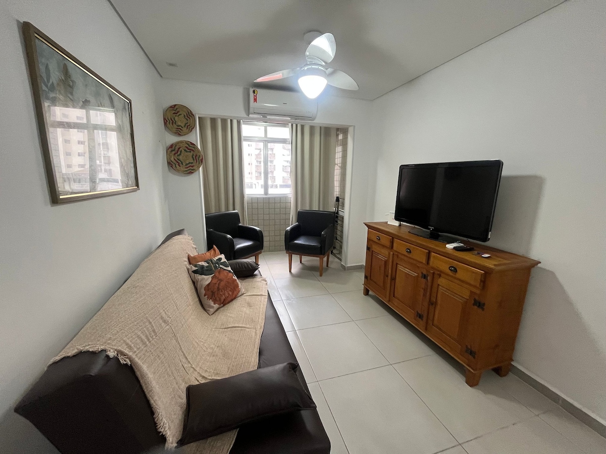 Apto 3 minutos a pé da praia, da calçada vc vê a orla da praia. 1 vaga de garagem no prédio, elevador, portaria 24h, fechadura eletrônica, varanda, 1 dorm com tv smart, cama king, ar condicionado, ventilador, 1 wc amplo. Sala espaçosa com sofá retrátil, tv smart, wi-fi, mesa de jantar e escrivaninha. Cooler, Roupas de cama, toalhas, secador e ferro. Localização top: próximo a mercados, padarias, barzinhos, farmácia, etc. Cozinha COMPLETA com filtro de água. Tem máquina de lavar e varal.