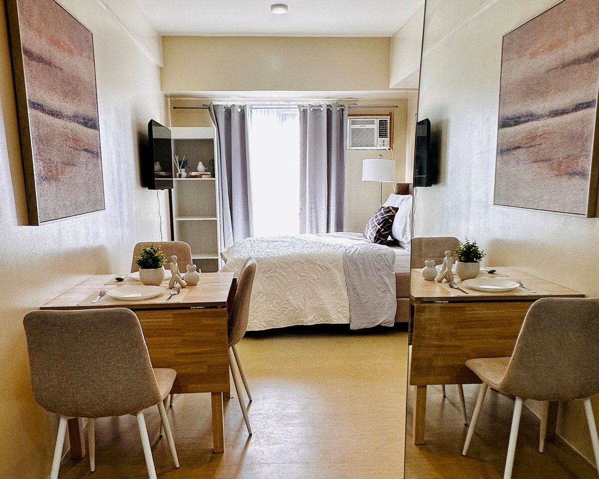 Inspired by rustic and minimalist design, this fully furnished studio is perfect for business or leisure stays in the heart of Iloilo. ✓double-size bed with pullout (up to 3 guests) ✓pool access ✓Wi-Fi ✓AC ✓Smart TV (with Netflix Premium) ✓Self Check-in. 🛍️ Walking distance to Atria Shops & Restaurants, QualiMed, Ateneo de Iloilo 🏙️ Near SM City, Festive Walk Mall, and Iloilo Convention Center 🛬 About 24–30 mins from the airport and 17–25 mins to Parola Wharf for Guimaras trips
