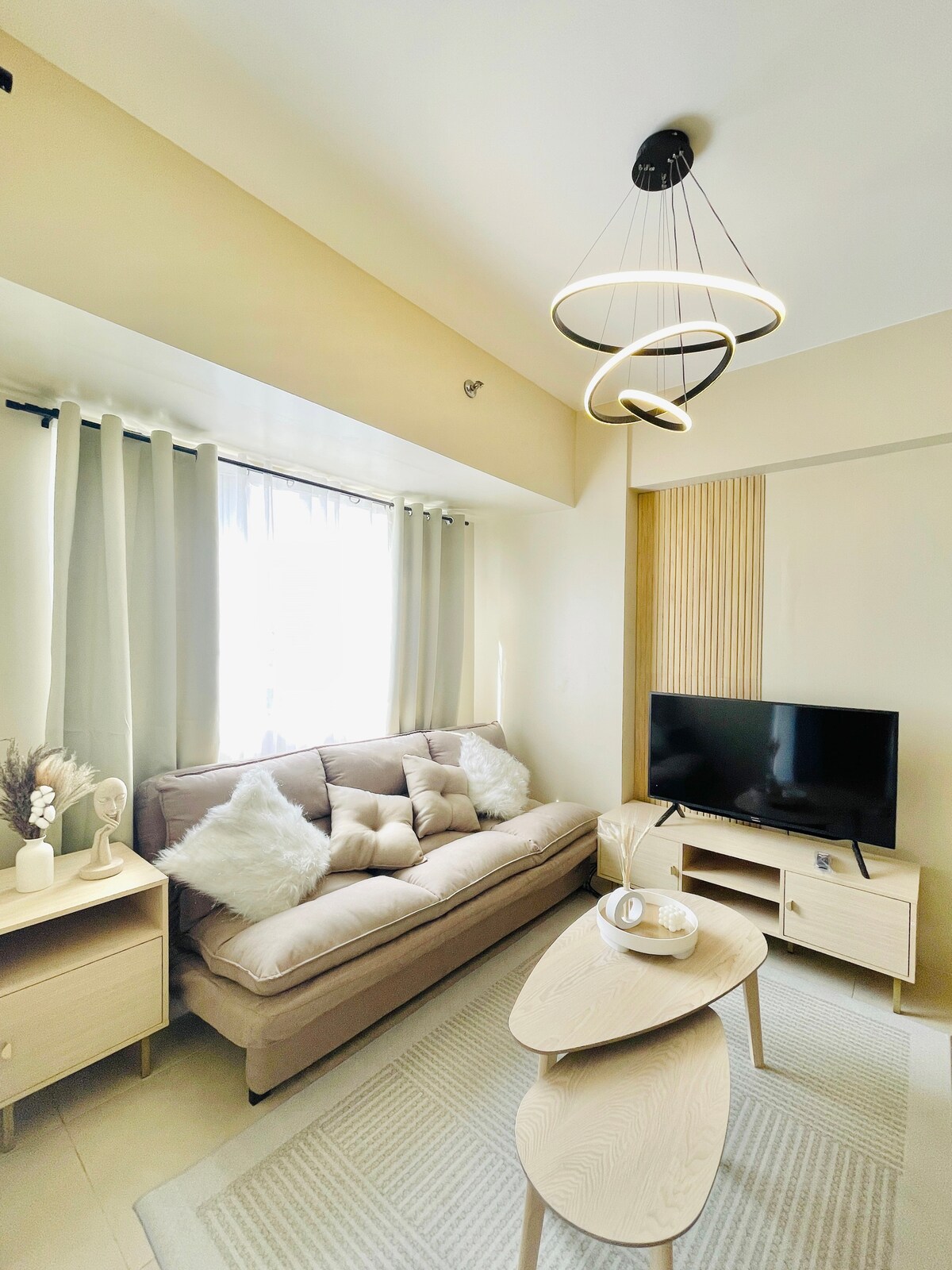 Relax and recharge in this cozy and comfortable studio apartment curated to have elements of nature to provide a sense of calm and tranquility. Located at the heart of the city, you can enjoy easy access to malls, restaurants and coffee shops. Our space offers a stylish retreat with an equipped kitchen, dining space, living area with a sofa bed that can accommodate additional guest, and a private balcony perfect for enjoying morning coffee or evening drinks.