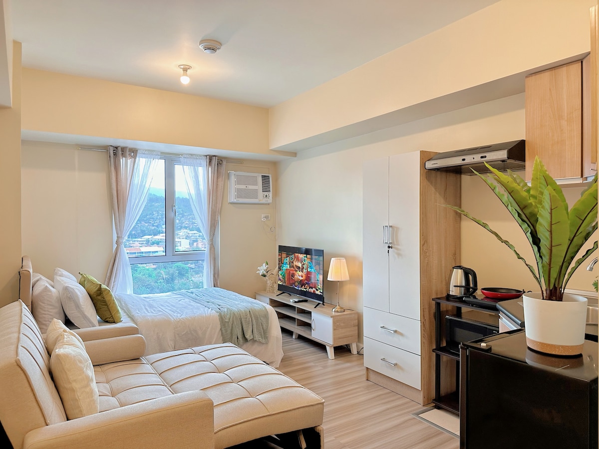 A cozy & thoughtfully furnished studio condo near Cebu’s major commercial & business hubs - IT Park & Ayala Center! So whether you’re visiting Cebu for business or leisure, you’re sure to be accessible & within reach to your destinations. Feel right at home and be greeted with the wonderful views of the sunrise, the hills and fairways. And with Fiber internet, always stay connected wether for work or Netflix. We’d love for you to experience Cebu and to feel right just at home.