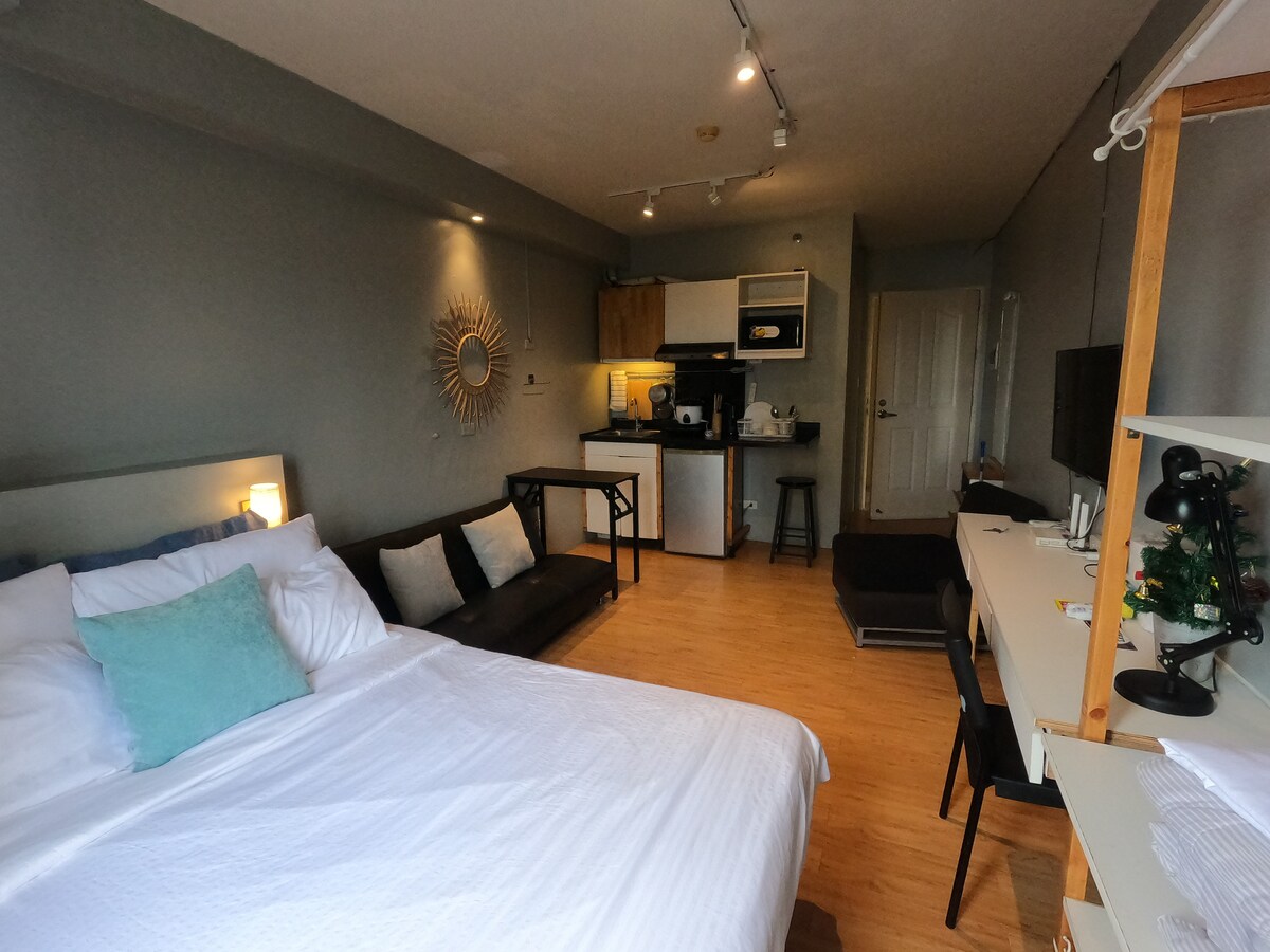 Feel right at home in our cozy well appointed modern studio in a central location where it never sleeps-CEBU IT PARK! Equipped with a double bed, refrigerator, electric counter-top stove, microwave, internet, and a 40" Android tv (Netflix and Youtube Premium). Plus a swimming pool, jogging track, 24 hour security, and specialty shops (7-Eleven, Tuf Barbershop, Massage Parlour, etc) all within the facility.