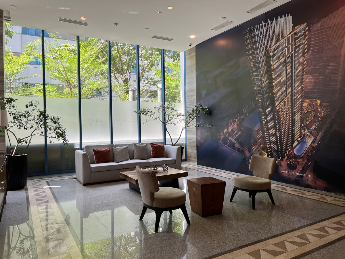 Experience high-end living in this prime 22nd-floor luxury studio at Park Avenue 38, IT Park, offering elegant city and bay views. Good for four people. Enjoy your private cinema projector, plush sofa bed, indoor plants, and germ-killing AC. Features hot & cold shower, full cooking facilities, and daily housekeeping. 7-Eleven is at the entrance, surrounded by the best 24/7 coffee shops and upscale restaurants.