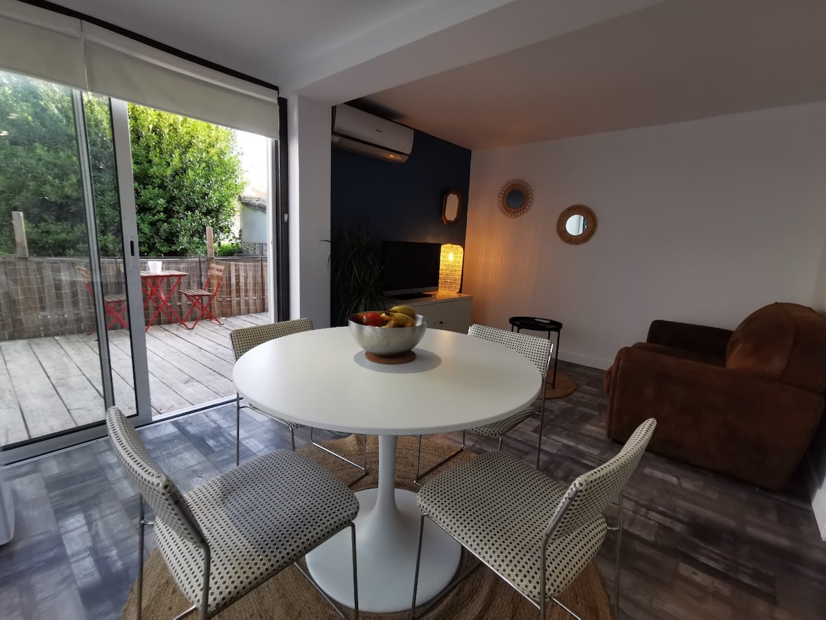 Petite maison de 30m². Chambre avec lit 160x200 cm, Salle de bain et Salon/Cuisine équipée avec terrasse et extérieur/Parking privés et clôturés. Entrée indépendante. Le canapé se déplie et peut servir de couchage supplémentaire. Lit parapluie disponible. Boite à clé pour les arrivées en dehors des heures prévues ou en fonction de nos disponibilités. LOGEMENT NON FUMEUR. Merci de fumer dehors ou de trouver un logement fumeur. Animaux : 25€ par séjour