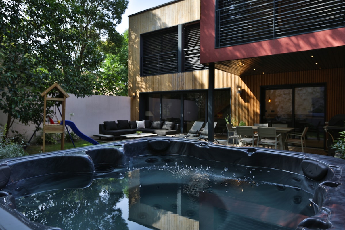 Belle villa de 160m², avec piscine intérieure chauffée. Au RDC, grand salon avec cuisine ouverte, une chambre(1 lit 160cm) avec salle de bain, WC. Au 1er étage 2 chambres(2 lits 140cm + 2 lits pliants 80cm), une salle de bain, wc, balcon. Grande terrasse et jardin arboré de 300m2, grand trampoline pour les enfants. 2 places de parking Les animaux ne sont pas admis. Les fêtes ne sont pas autorisées.