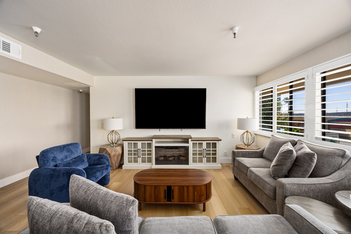 Newly Renovated Suite, 2026! Our spacious Family Suite features two bedrooms, one bath, with a king bed, queen bed, and a queen pullout sofa. Enjoy stunning harbor views from your private balcony. The suite includes a fully equipped kitchen with a stovetop oven, microwave, and dining table for six. Located close to the ocean, shops, and restaurants, our inn offers free covered parking, secure elevator access, and golf cart rentals for exploring Morro Bay.