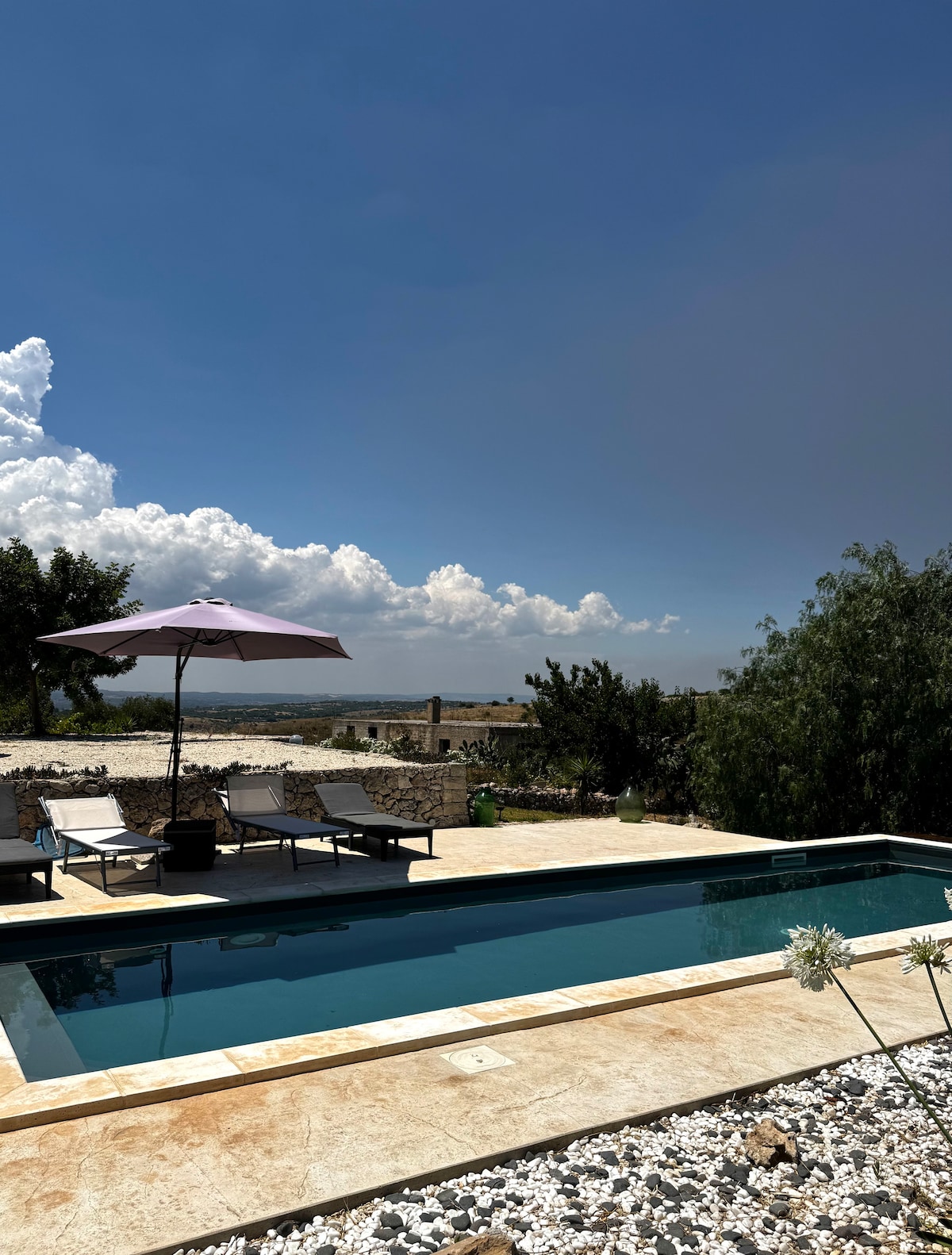 Ancient walls and modern conveniences coexist in peaceful harmony in this architect's house. Glazed doors in the bedrooms and living areas open onto a rolling landscape. Dine alfresco on a sheltered patio and go for a swim in a pool with a view. Le Casuzze is a holiday home which was completed in the summer of 2017 and designed by an architect from Bologna. It is perfectly integrated in the landscape behind the baroque town of Noto, and offers a superb view of the sea, the town and the natural beauty of the surrounding area. Finding a balance between luxury and simplicity is difficult task, which the the architect has mastered incredibly well. The three bedrooms (all of which have a separate en-suite bathroom) have replaced the stables, whilst the living room is placed in the old housing quarters. There where empty space previously separated the two buildings now stands the kitchen. A fourth bathroom is accessible via the living-room. All the rooms are connected with one another and can also be accessed via the outside terraces, which face the south and east respecitively – the former offering a superb panomaric view of the surrounding landscape. The seven-by-seven-meter large pool was designed to resemble a Gebbia: an antique water reservoir; The pool area constituting the transition between the house and the mediterranean Macchia. The entire property is defined by an incredibly calm and harmonious atmosphere and is the perfect place to wind down. Le Casuzze is located on a beautiful ridge behind Noto, overlooking the city and the sea. Take wonderful walks through the Mediterranean scrub from here, undisturbed by the few houses in the neighborhood.