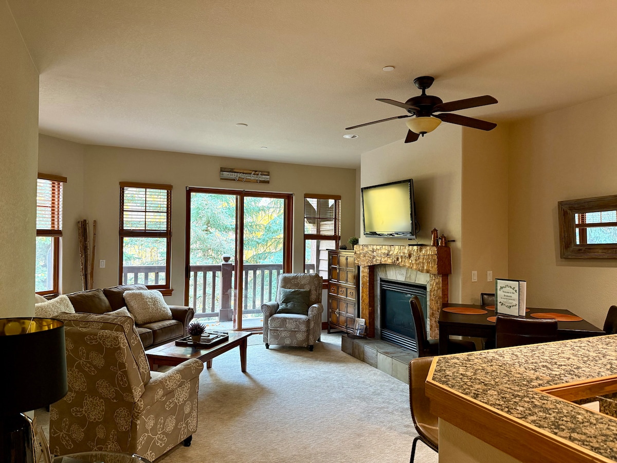 PLEASE NOTE: Pool complex closed April 27th-mid May 2026 Early check in/Late check out not available. Kick back and relax in this calm, stylish space. Our warm and welcoming condo is nestled in a quiet but convenient area very close to lifts and town. Cozy up to the gas fireplace, Relax on the covered deck Adirondak chairs with coffee or a cocktail. Use the provided robes to take an easy stroll to the pool and hot tubs after a day of skiing or hiking. Mountain luxury is just a click away!