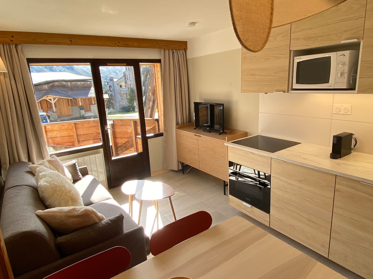 Skis aux pieds & emplacement idéal ! Joli studio très fonctionnel situé dans le charmant quartier du Festival, au coeur de la station. Emplacement ultra central, sont accessibles à pieds les commerces et restaurants du centre de la station. Situé dans un bel immeuble sécurisé, il donne sur le côté montagne garantissant calme et tranquillité avec une sublime vue sud-ouest sur les montagnes. Entièrement rénové avec des materiaux nobles, cuisine équipée et SDB douche balnéo & sèche serviettes. 20m2