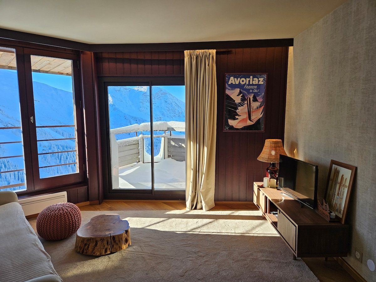 Beautiful flat located in the heart of Avoriaz (building Hauts-Forts 2, a listed historical monument), with direct view over the ski slopes, fully renovated. It's 5 min walking distance from the Prodains cable car and from all amenities in the village center. A bakery is down the building and you can start and arrive by ski. Every guest can benefit from 5% discount on ski pass and 10% on ski equipement rental.