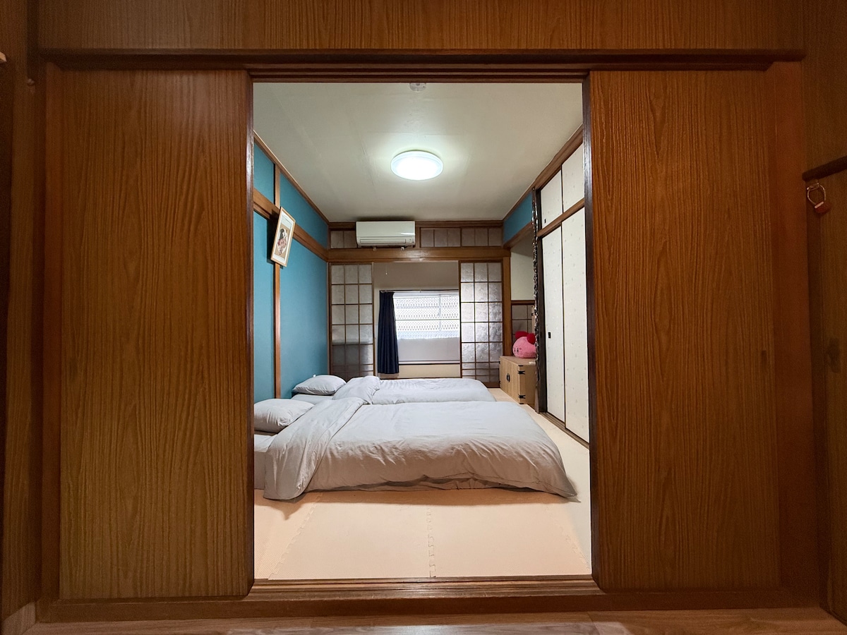 这是一间安静、有阳光的三层3ldk独栋民宿。采用日本传统真璧工法的木结构住宅,可以感受木材的温度。空间安静、舒适,住起来像在家一样。 • 🚶 交通超级方便,步行约 5 分钟到天下茶屋站,直达关西机场约 39 分钟,前往难波、日本桥、心斋桥、道顿堀、USJ、奈良、京都都非常方便。 • ☀️ 朝南+朝东角地,采光极佳,每个房间都很明亮。 • 🏠 三层空间、卧室全部独立,多人入住也能各自休息,不互相打扰。 • 🛒 生活机能完善, 7-11 步行约 2 分钟,大型超市步行约 6 分钟,日常采购方便。 • 🌤 带天窗的小阁楼 很安静,适合放空、看书、写字,回味旅途片刻。 • 🌿 一楼传统和室+小花园 氛围宁静,哪怕只是坐着放空,也会觉得很舒服。 • 🍽 二楼餐厅+厨房+8 人餐桌 适合一起吃饭、聊天,慢慢生活。 • 🧳 宽敞玄关空间、可放置多件大型行李 • 📶 高速 Wi-Fi+50 寸智能电视(支持多语言)适合长时间停留、远程办公,也方便不外出的长辈休息。 如果你正在寻找一个安静、有阳光、住起来舒服的大阪小家,希望这间房,能陪你度过一段放慢脚步的旅程。