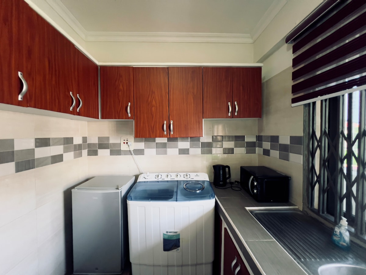Expansive 2BR condo in Gbawe, Accra, exclusively yours to enjoy. Immerse in roomy comfort and chic design. **Features:** - 220m^2 space - Full kitchen for culinary delights - High-speed WiFi and AC in en-suite rooms - Hot water for your comfort - Outdoor bliss on the balcony with a BBQ grill - Stay active with provided gym equipment - Convenience of a washing machine - No shared spaces Experience the best in urban living, with tailored comfort and thoughtful amenities in this stylish retreat.