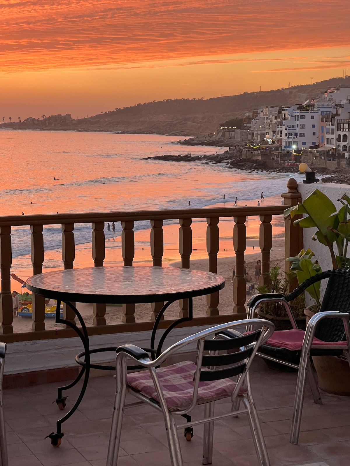 C'est le seul appartement dont le balcon de 17m2 est construit au dessus du chemin qui longe la plage, offrant une vue exceptionnelle sur les vagues, le village, les pêcheurs, les surfeurs. Très confortable, décoré et entretenu avec soin pour un séjour exceptionnel au dessus de l'océan, proche des nombreux cafés et restaurants longeant la plage et à 2 pas des écoles de surf, au coeur de ce village berbère convivial mêlant pêcheurs, commerçants, surfeurs du monde entier...et quelques touristes.