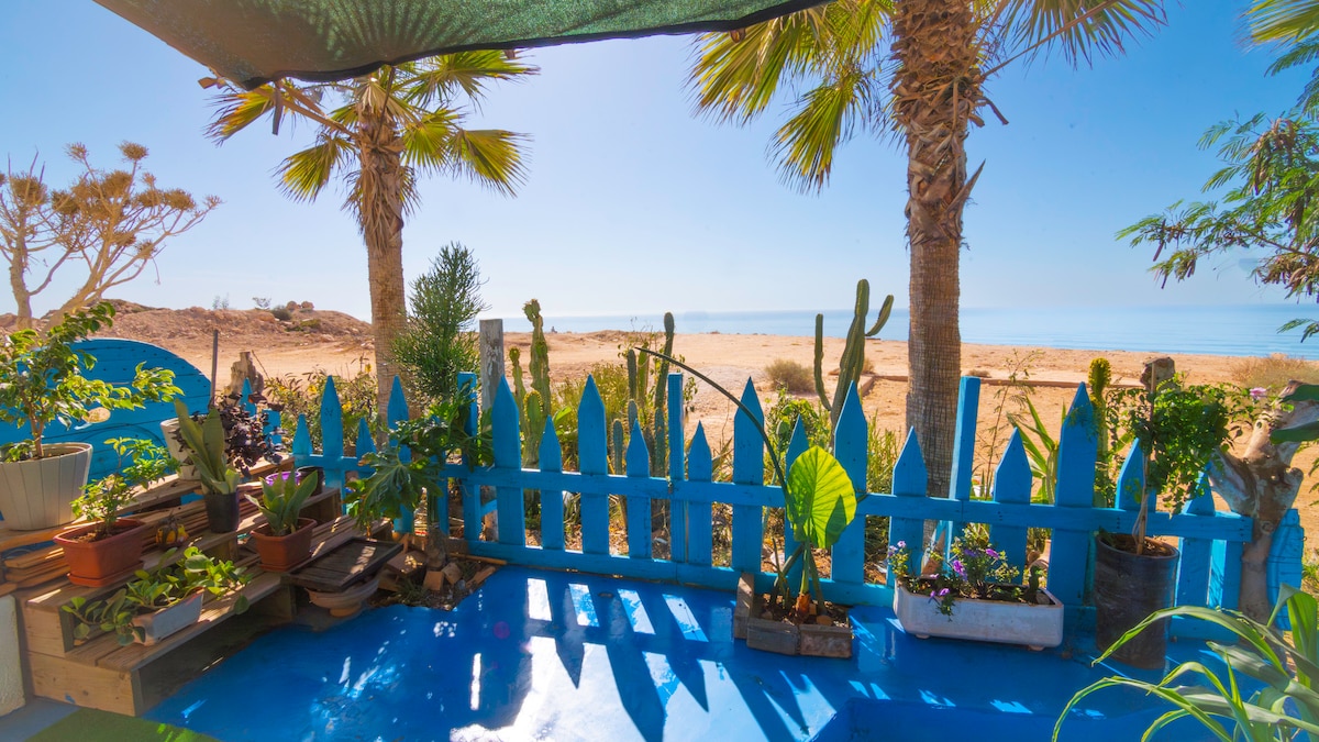 Nestled in vibrant Colorful Aghroud village, Rosyplage is a beachfront gem offering stunning ocean views from every room. Ground level:fully-equipped studio. First floor feels like being on a boat with a Moroccan lounge & 75-inch Netflix-ready TV.Two sea-facing bedrooms await upstairs. Top-level: kitchen leading to a terrace, followed by a sun-soaked solarium ideal for yoga & sunsets. Modern comforts meet coastal charm.Note: The house has 4 levels and many stairs not suitable for young children.