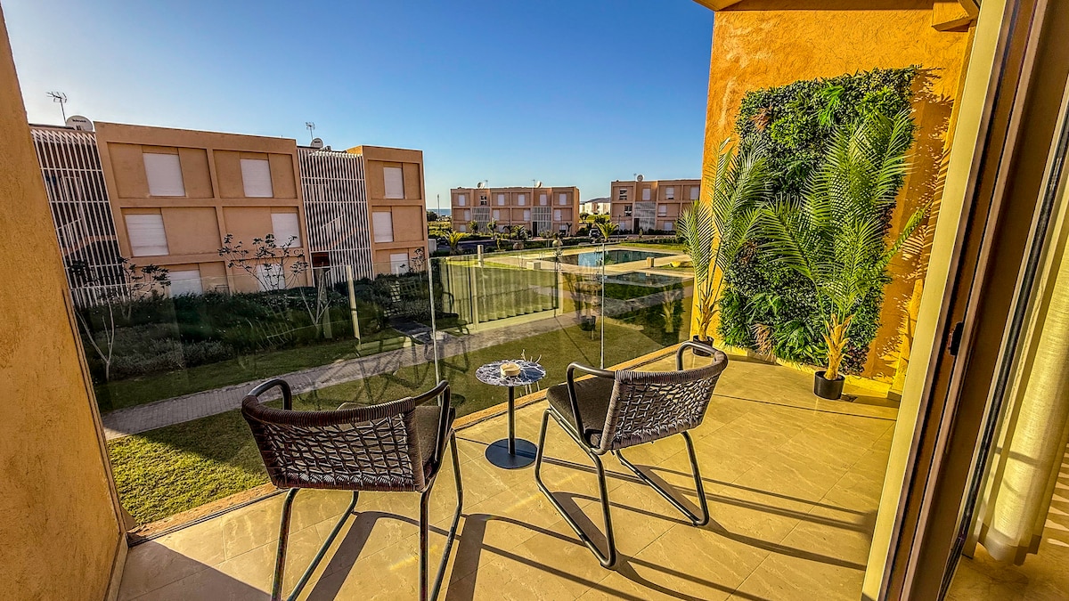 Ocean & Pool View with Private Terrace Taghazout Bay Experience a unique stay in Taghazout Bay in a modern flat offering stunning views of the pool on one side, and the golf course and ocean on the other. Relax on the spacious private terrace, perfect for sunbathing, reading , or enjoying meals with a panoramic view. Located in a secure residence with a swimming pool, just minutes from the beach and the golf this bright and fully equipped apartment is ideal for relaxation by the Atlantic Ocean.