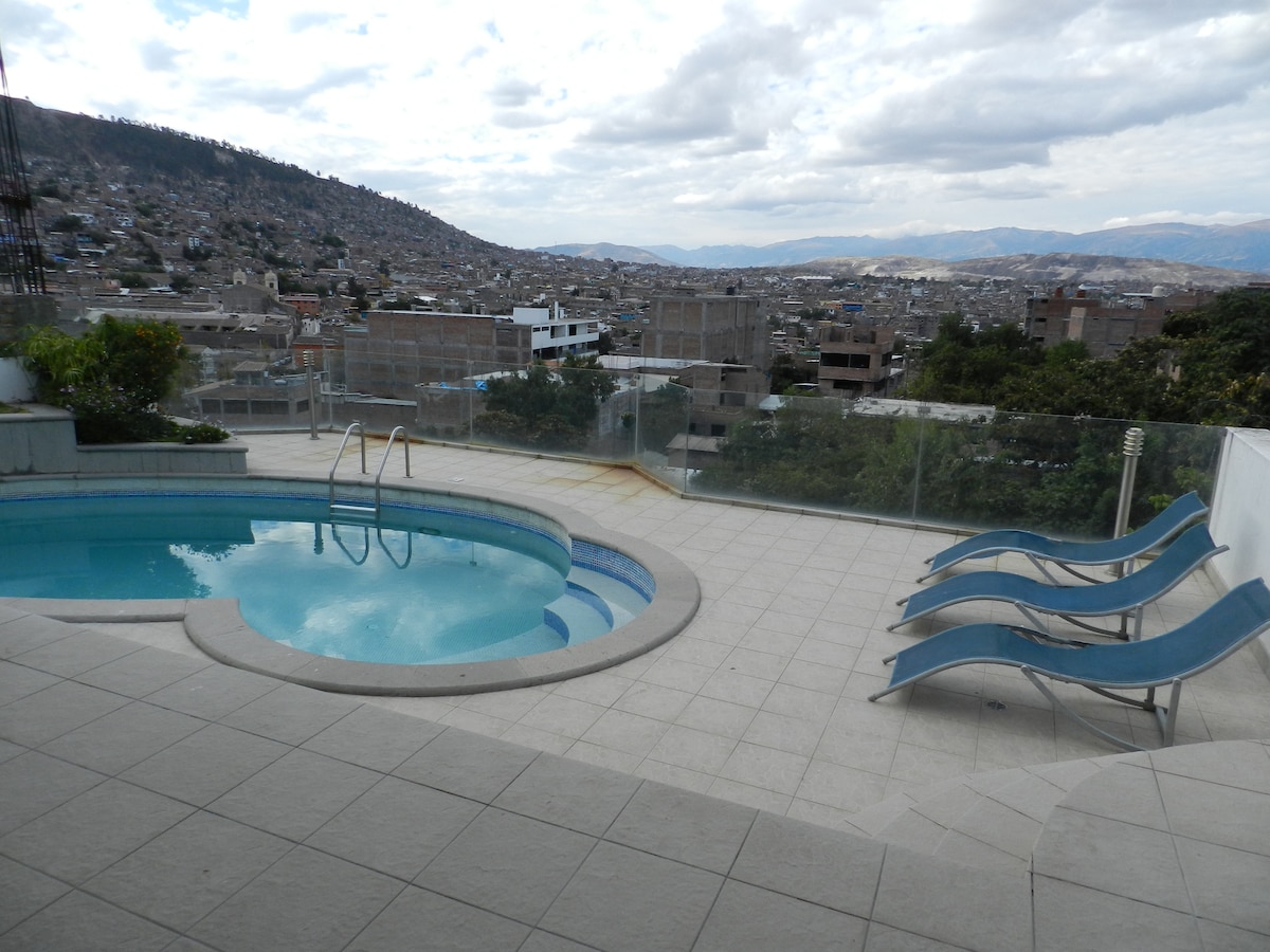 La casa está ubicada a 8 cuadras de la plaza de armas y a 50 m de la Alameda Valdelirios, el dormitorio es independiente tiene buena iluminación cuenta con una cama matrimonial y otra de plaza y media, mesa y silla de trabajo, clóset, TV con cable, Netflix y WI FI. Cuenta con cochera, estar, sala, comedor, cocina equipada, jardín con terraza amoblada y parrilla a carbón, gimnasio, sala de juegos y una piscina con terraza amoblada y equipada que es el mirador para apreciar la ciudad de Ayacucho.