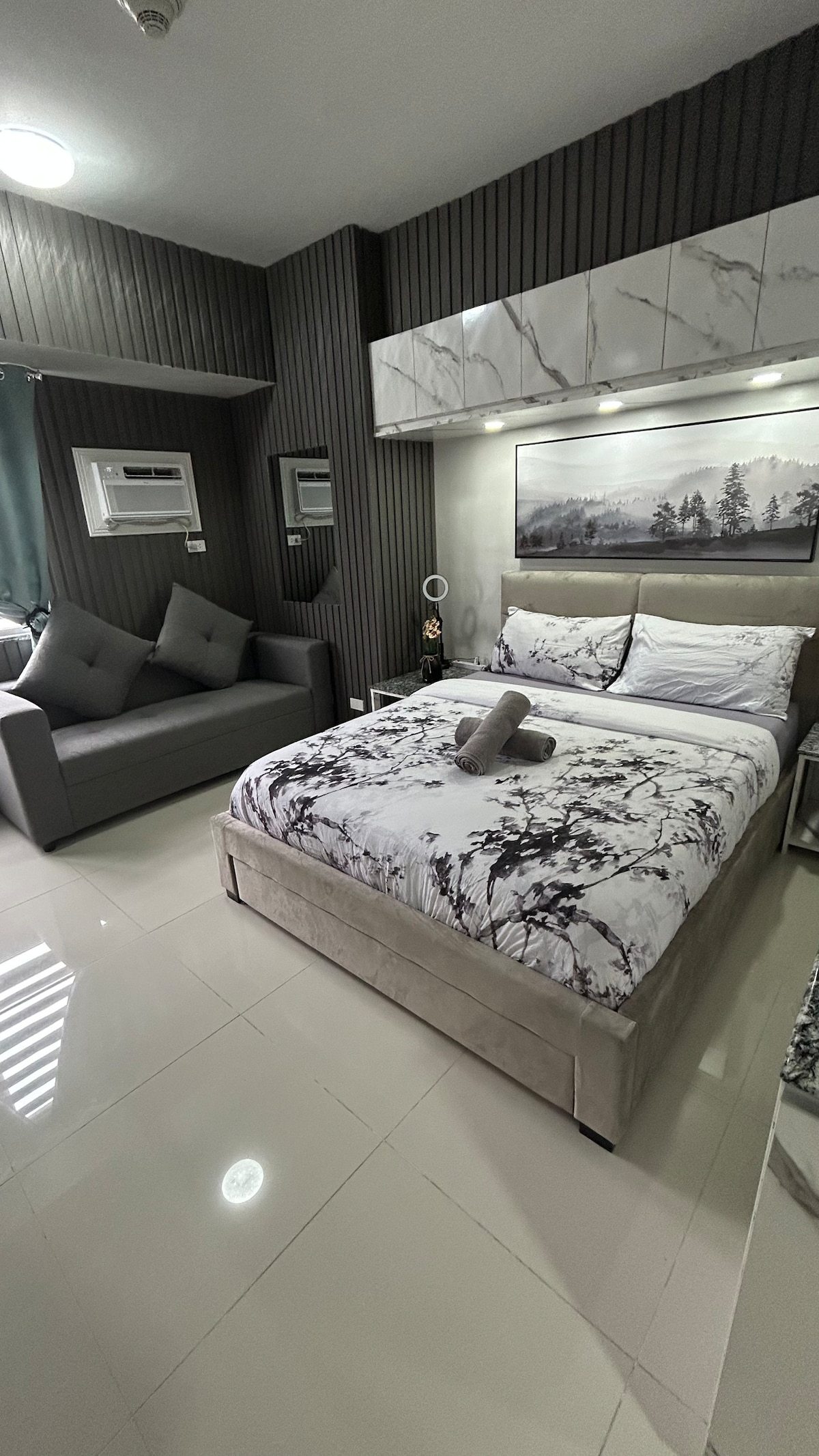 Elegant 1BR 27F Views. Soar above the city’s most prestigious address. Steps from mall, cafés, & restaurants. Enjoy fast Wi-Fi, smart appliances, full kitchen, washer/dryer & a cozy sofa bed. Pool & gym access included. Please be advised of the ongoing construction on this side of the building. There may be construction noise between 10:00AM to 7:00PM. We will not be able to make further arrangements if you already have checked in.