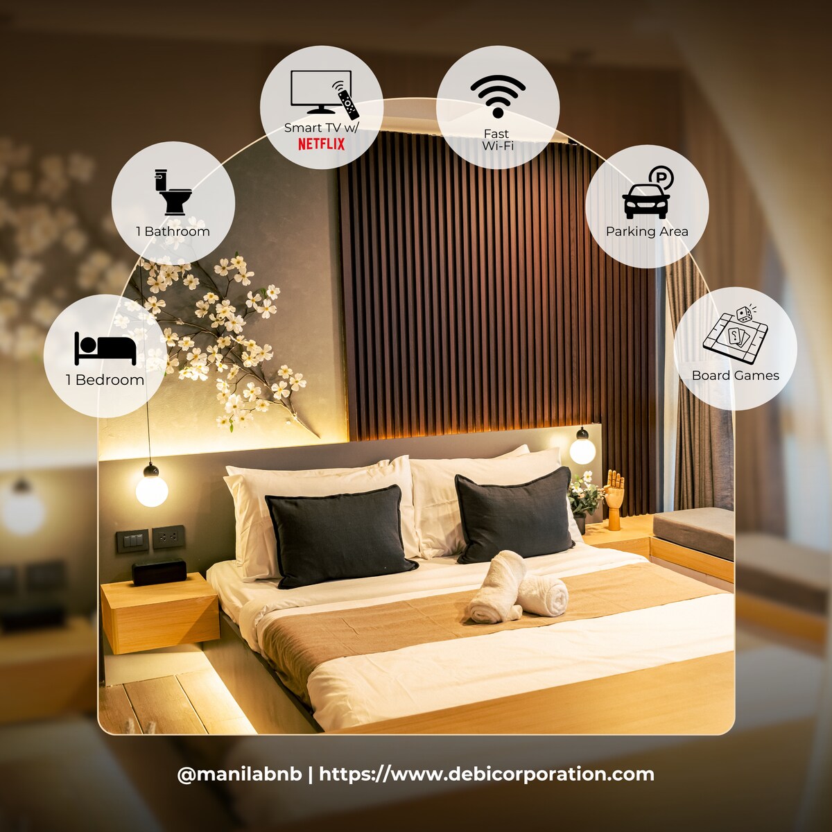 Book this luxury stay at the center of BGC. Everything is just a few steps away. Prime offices and high end malls surround Uptown Parksuites. Experience a cosmopolitan getaway at the Uptown Mall. Explore unique food and shopping concepts. Party the night away at premier bars right at your doorstep. Unwind in our Mid Century Modern bedroom unit. Comforts include a 55 inch SMART TV, 400 MBPS internet and a study area. Enjoy a comfortable and stylish experience at this centrally-located place.