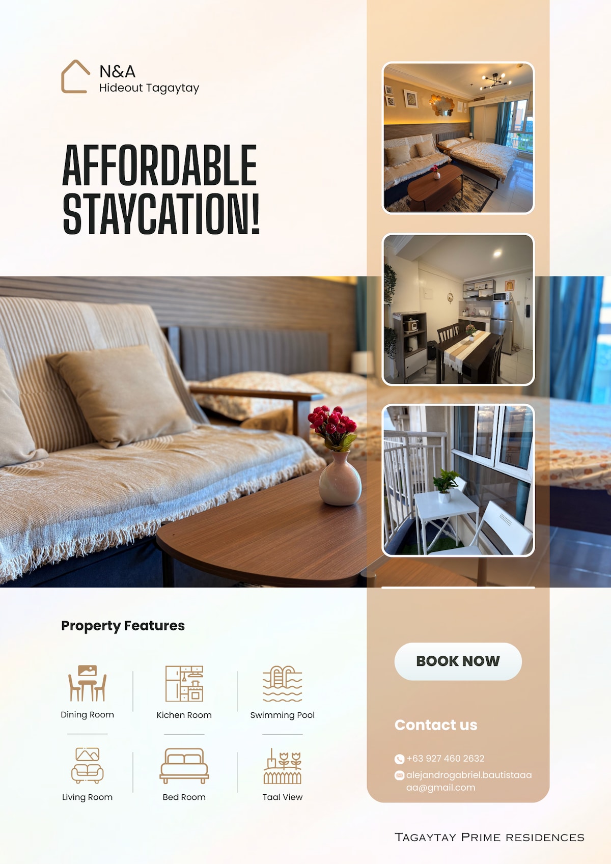 Peach House Tagaytay offers a relaxing and homey vibe with its soft modern and aesthetic interiors. Just the right place to recharge, enjoy a warm cup of coffee, or just lay back and watch Netflix or Disney+ under a soft blanket while enjoying the cool Tagaytay weather. This modern escape also offers stunning views of Taal Lake and Tagaytay sunset which can be best appreciated from the balcony. Note: Swimming pool under renovation due to adverse weather, reopening delayed until Jan 16, 2026.