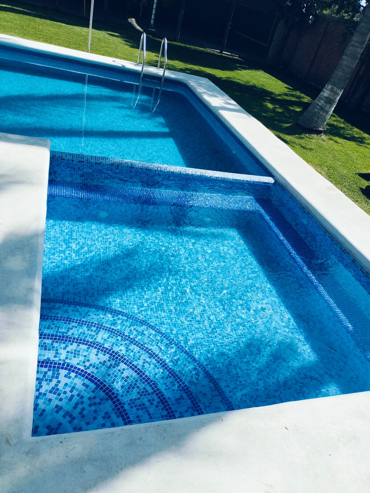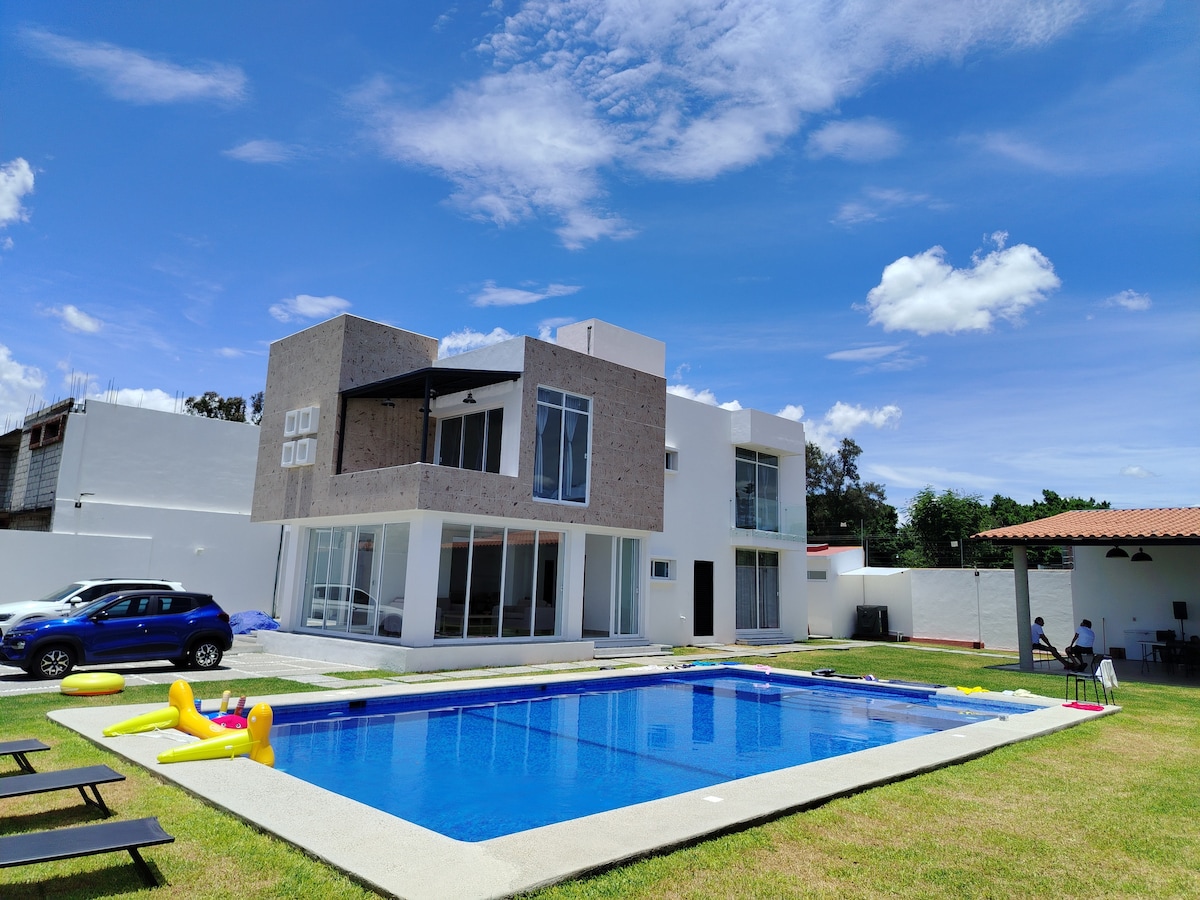 Agradable casa de descaso perfecta para familias chicas o medianas , con alberca privada y climatizada(mediante paneles solares), a 15 minutos de Cocoyoc y Oaxtepec. Estamos a unos minutos del parque acuático Hurriacan Harbor de six flags, a 25 minutos de Yecapixtla y a media hora de Tepoztlán. Disfruta de las 2 albercas que tenemos, una dentro de la privada y la otra en el patio trasero de la casa, climatizada(paneles) y solo para ti y tu familia. Prepara una carnita asada en el Roof Garden.