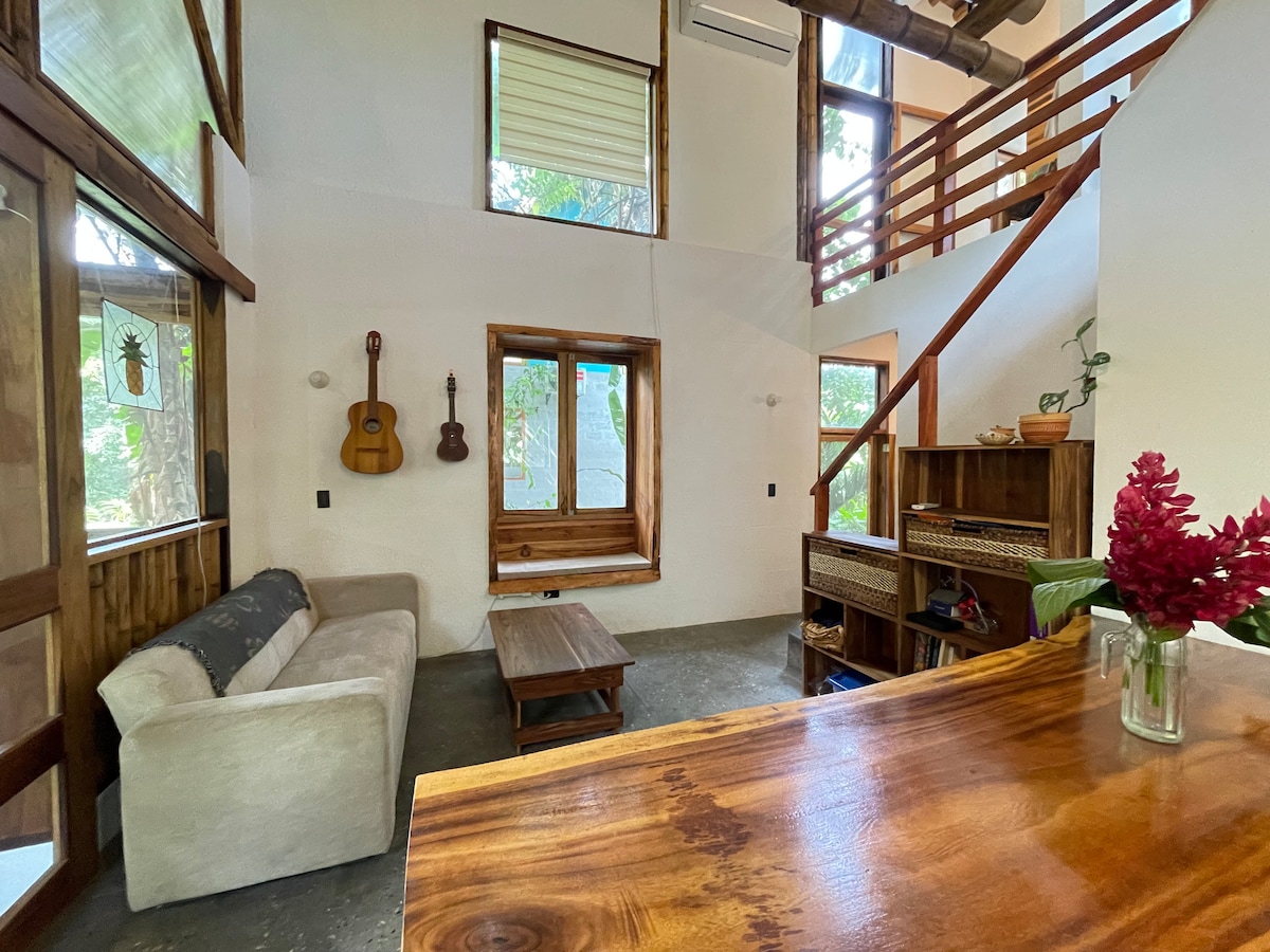 The Casita De Bambu is a COZY CABIN in a hidden oasis with a POOL in the heart of Ayampe--just 3 blocks to the best SURFING BEACH & sleeps up to 6 people! -PRIVACY in a cabin with TALL TREES; -cook delicious meals in indoor and outdoor KITCHENS + BBQ; -family-friendly POOL with shallow play/tanning area; -LOUNGE about or do YOGA under the PERGOLA; -enjoy the CHILD-FRIENDLY green backyard; -SWING under shady trees. Follow on Insta @CasitaDeBambu. Bookings through Airbnb only :)