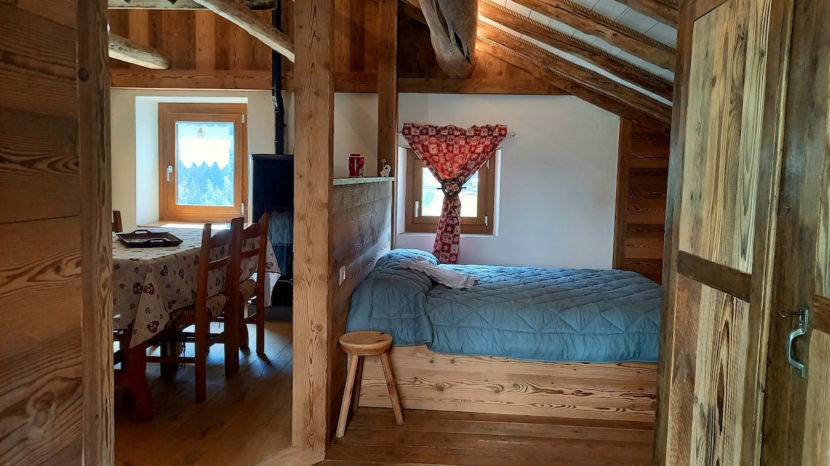 Alps Mountains. Italy. Aosta Valley. A cabin in a small village at 1600 meters,in the peace of meadows, grazing cows and mountains. Snow (usually) in the winter. A place of the heart, lovingly restored preserving the ancient beams of the roof. A wonderful view from the large windows and a special tranquility for those in search of peace, warmth and relaxation. The furniture is very nice: wood above all, but also more lively colors, and modern comforts. Quiet excursions, both on snowshoes or ski.