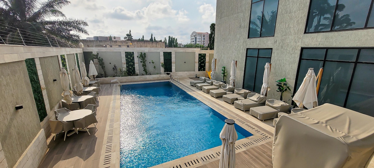 Executive 1 bedroom apartment + living room & open plan kitchen close to the airport, and in the heart of the business district. Short and long-term stays . Peaceful and serene, ideal for both working and relaxation lifestyles. Facility has a lounge, a gym, a restaurant, a swimming pool and a rooftop. Our management can also cater for your lunches and dinners privately, and provide meals for your entire stay. For your utmost comfort, book now and experience our top-notch hospitality!