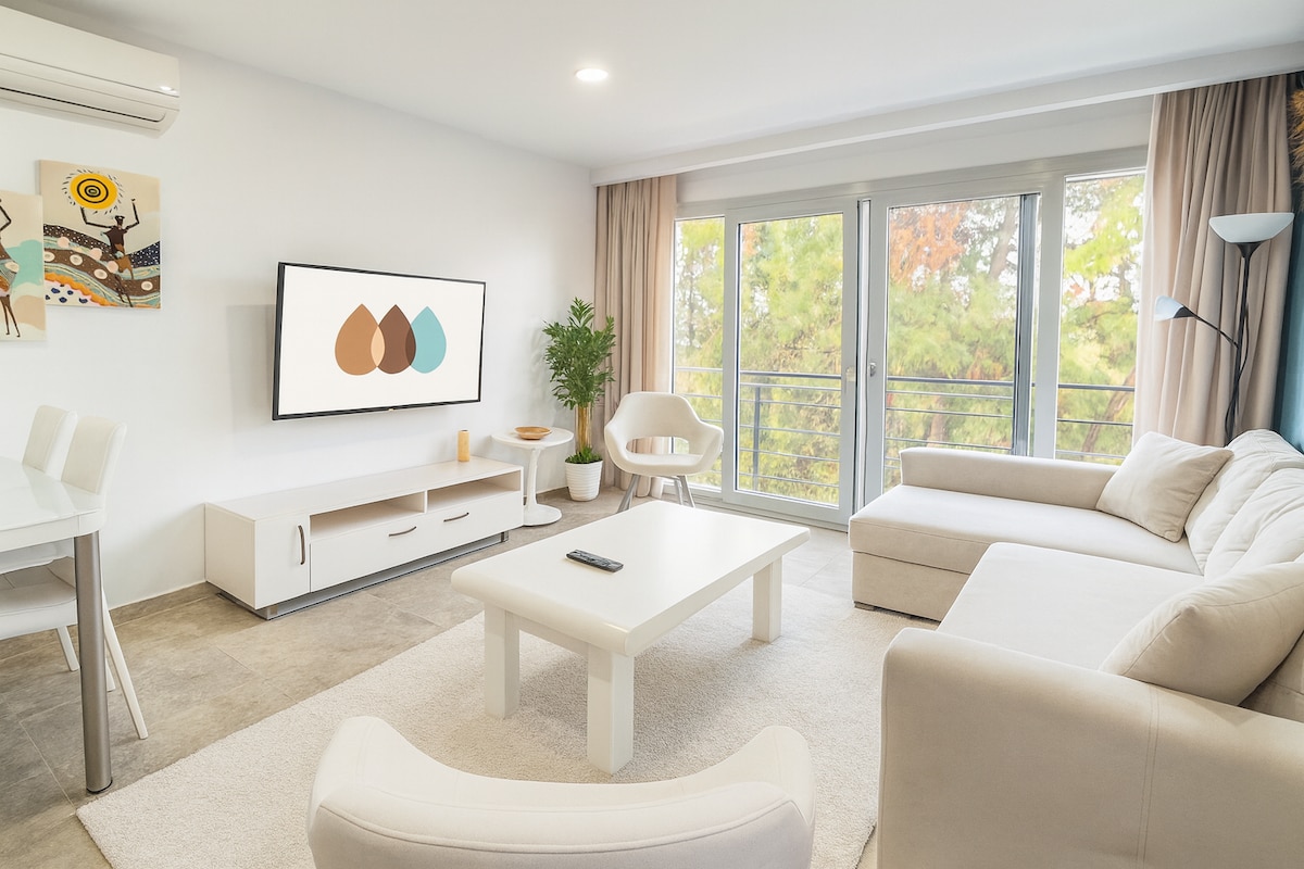 Recharge in Kusadasi Sogucak at Lavender Residence: a stylish 2BR/2BA apartment (sleeps 6) with private entrance and a large forest-view balcony. Fully equipped kitchen, A/C + heating, Wi-Fi and free parking. Enjoy shared pools—210 m² outdoor (Apr–Oct) and heated indoor (May–Jun & Oct–Nov)—plus gym, kids’ playground and on-site reception/security. Panorama restaurant available (paid). Long Beach 7–8 min by car. Secure your dates today!