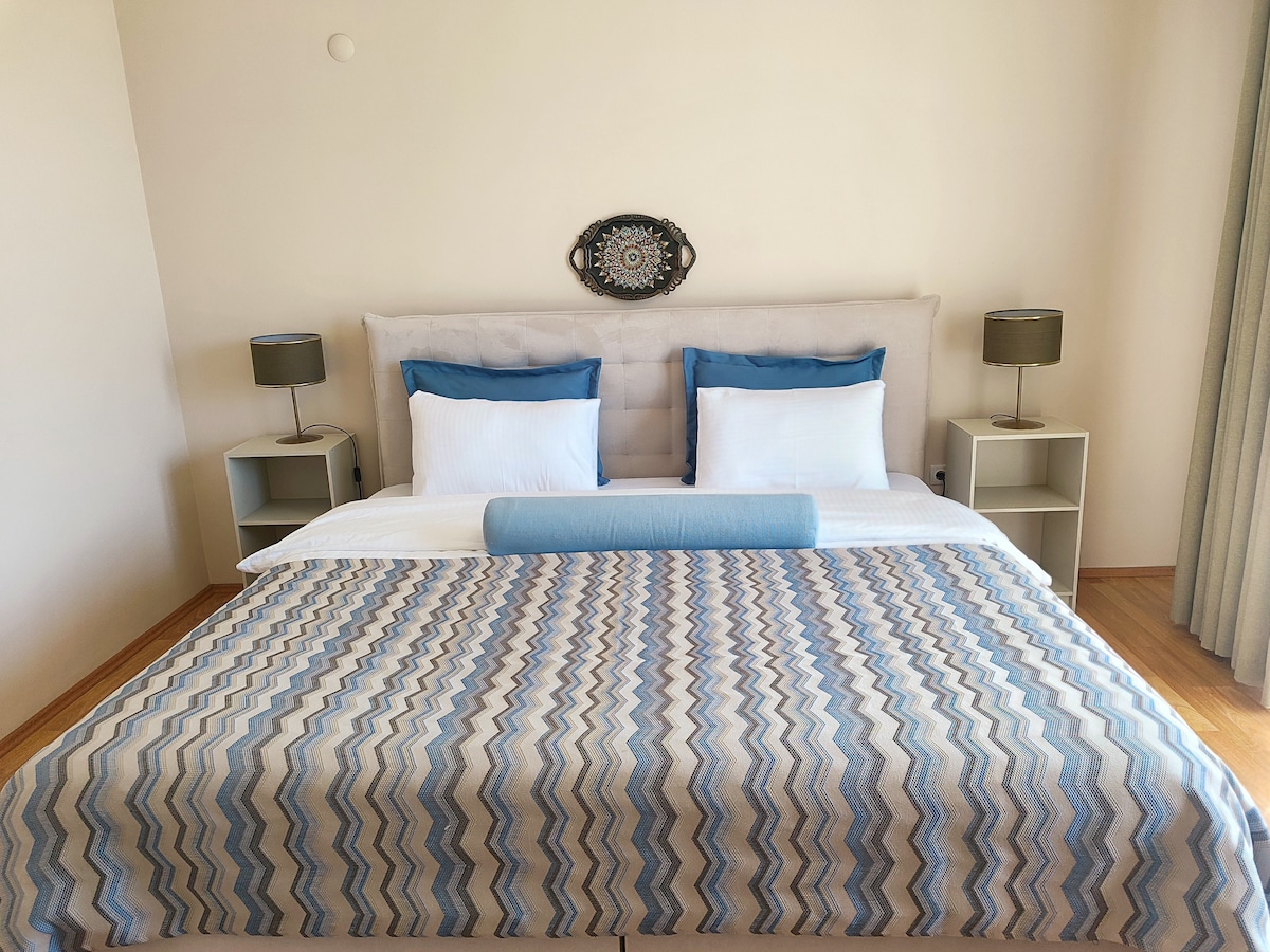 I'm sure you'll have a wonderful experience at our place located in the heart of Kuşadası. This ground floor apartment, perfect for up to 3+1 guests, has a total living area of 85 square meters. There are 2 separate bedrooms, one with a double bed and the other with a single bed. You can enjoy spending time in your private garden throughout the summer. The city center is within easy walking distance, and if you prefer, public transportation is available right in front of the house.