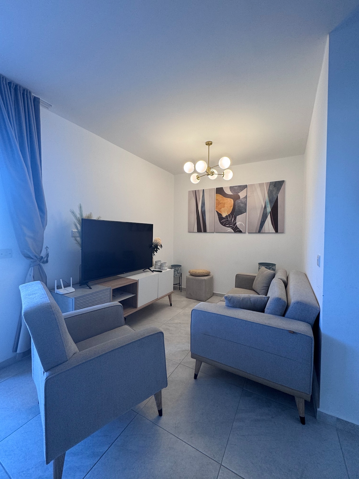 Apartment is 78 sq.m. and extends itself to 18 sq. balcony where one can enjoy great sights to the Mediterranean sea; it has 3 bedrooms and 2 bathrooms and is fully equipped with all the essentials. The wonderful Thalassa beach is located just few minutes walk from the apartment. Cosy "Deks" restaurant as well as Mini-market, Large outside pool, indoor heated pool, great Spa-center and Gym available on site. Larnaca and Ercan airports can be reached within 1.10 hour drive.