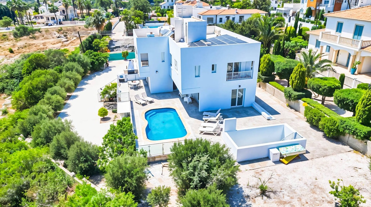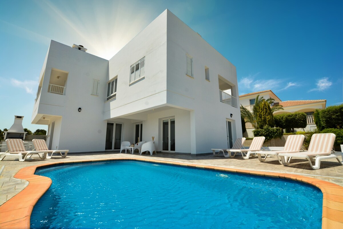 This elegant and modern 3 bedroom seafront villa is located in the Cape Greco area of Protaras, and is just a short walk to the beautiful Konnos Bay Beach. Its contemporary décor and furnishings, peaceful surroundings and stunning views, make this the ultimate villa for family or groups of friends looking for a luxury retreat