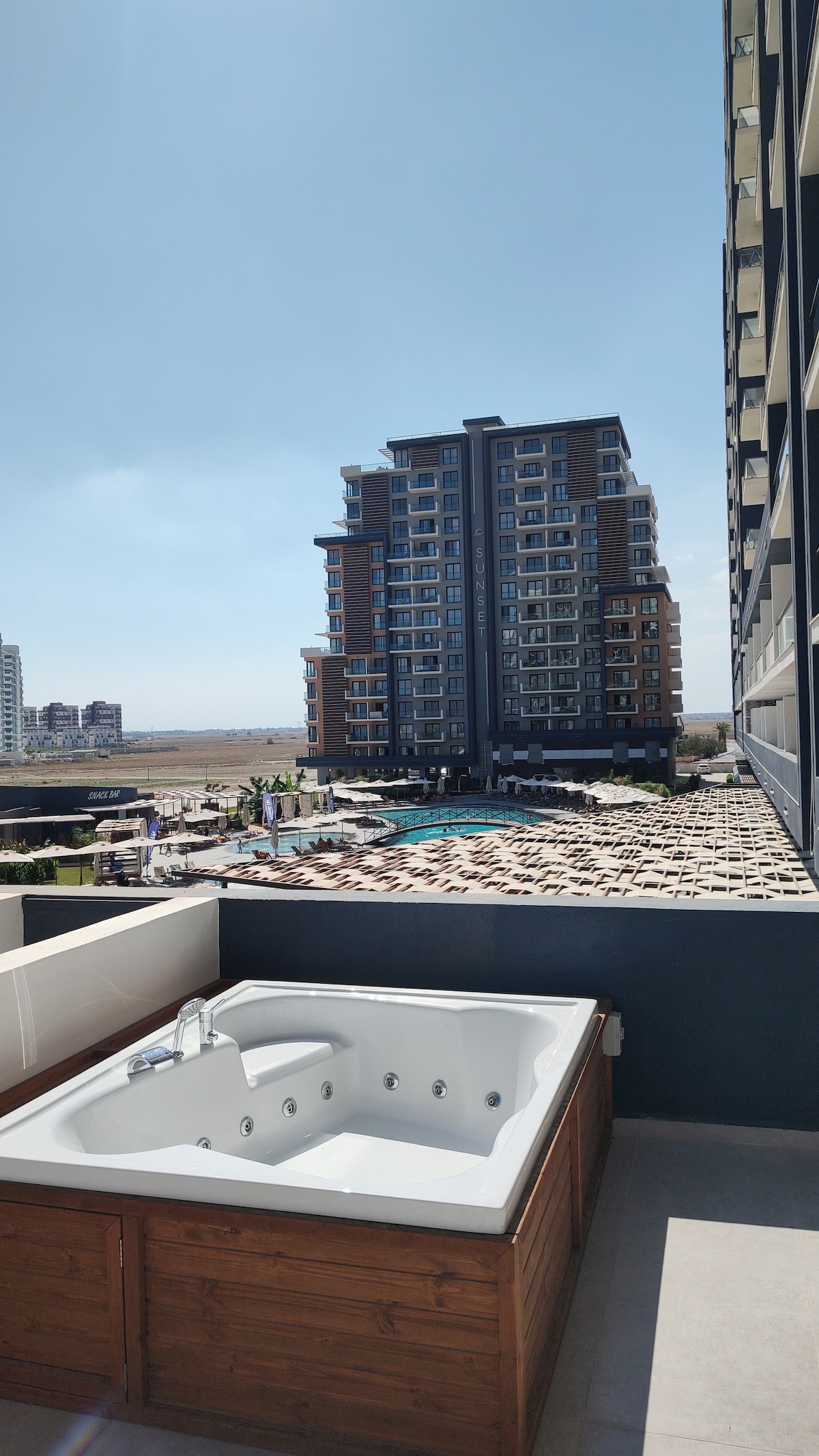 Unobstructed sea view from 7th floor, fully furnished, air-conditioned, self-contained private 1+1 flat within a holiday resort with 13 pools, water slides, spa, kids corner, bike rental, car hire, many different restaurants, supermarket, Karaoke and walking distance to the newly renovated Long Beach area, just a walk away. Famagusta is only 20 minutes drive and it's a scenic ride to Karpaz along the coast from there. It won't be long before you call this place your home away from home!